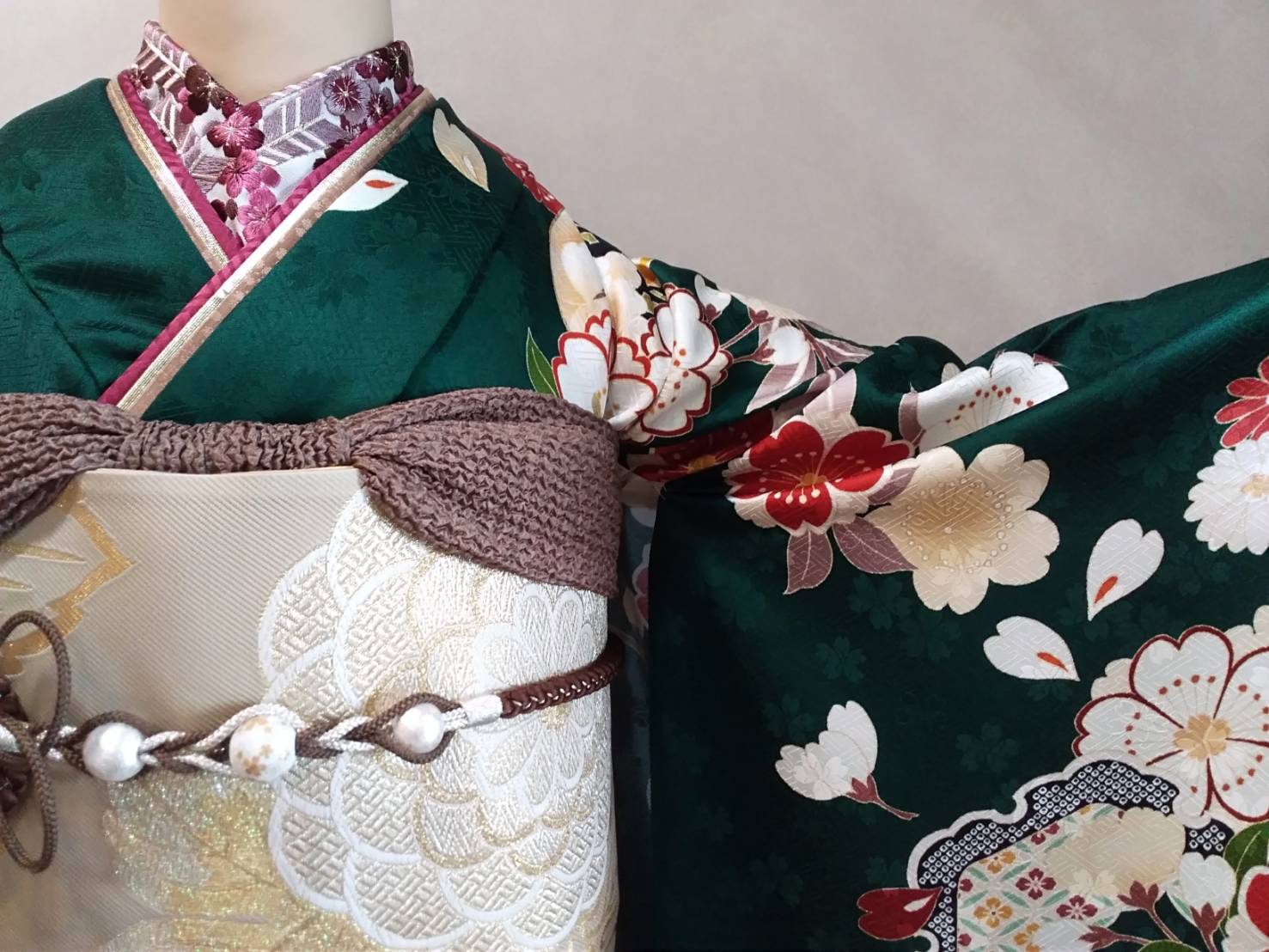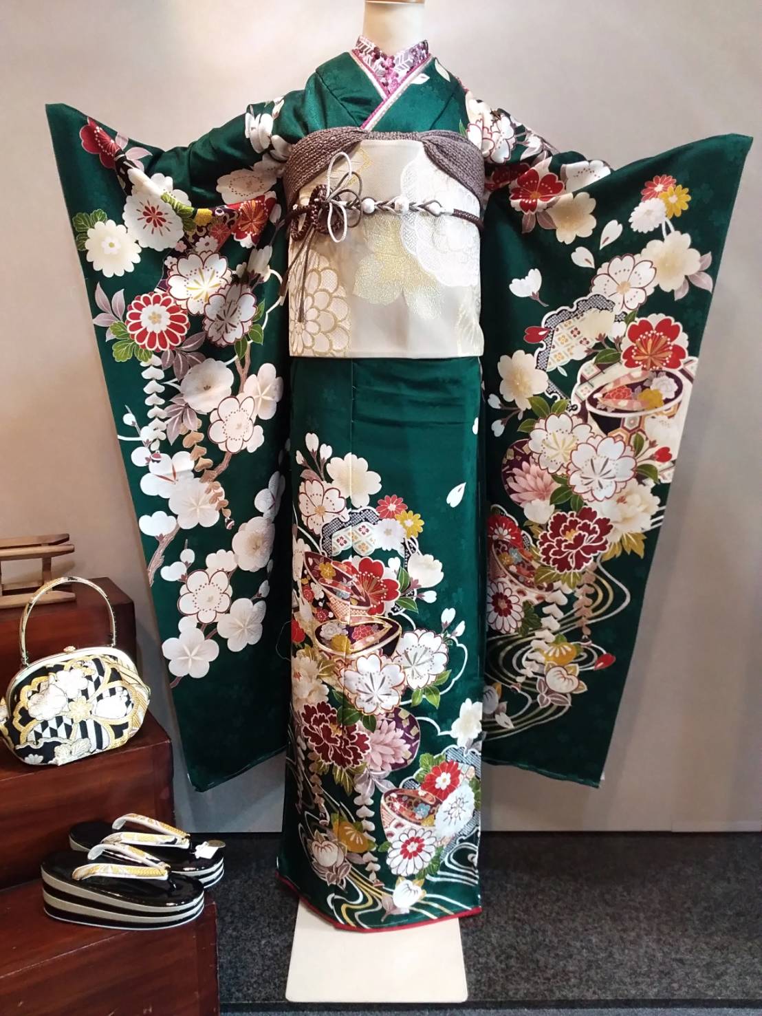 ぽっくり柄のお振袖は、可愛らしいイメージの色合いが多いですが、こちらは深緑に牡丹、桜、梅、藤などに流水とぽっくりが落ち着いた色合いで描かれたお振袖。