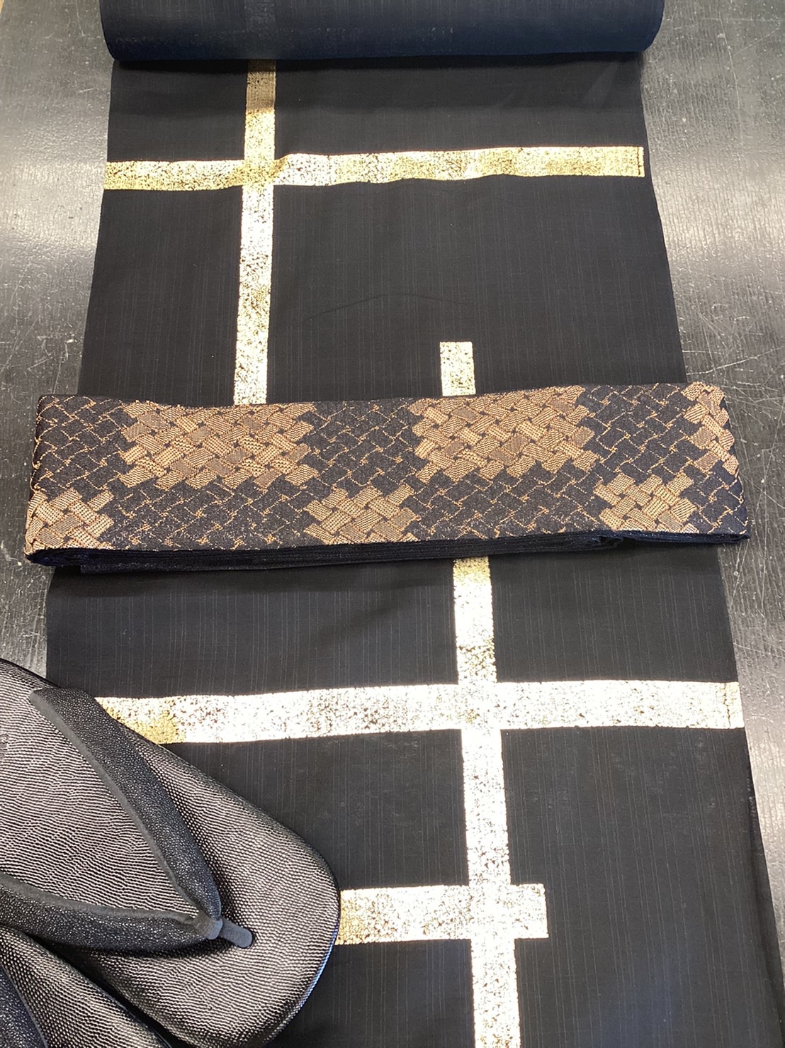 今回ご紹介するのは誉田屋源兵衛の破れ格子の浴衣に合わせて、竹織の帯。ゴールドのラインに合わせて、ゴールドに輝く網代柄の帯。
