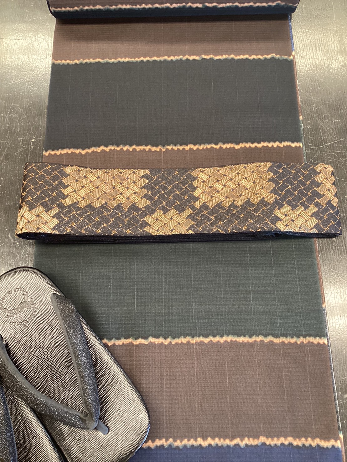 こちらは、茶、紺、黒の横段の熨斗目柄に竹織の帯を合わせて。