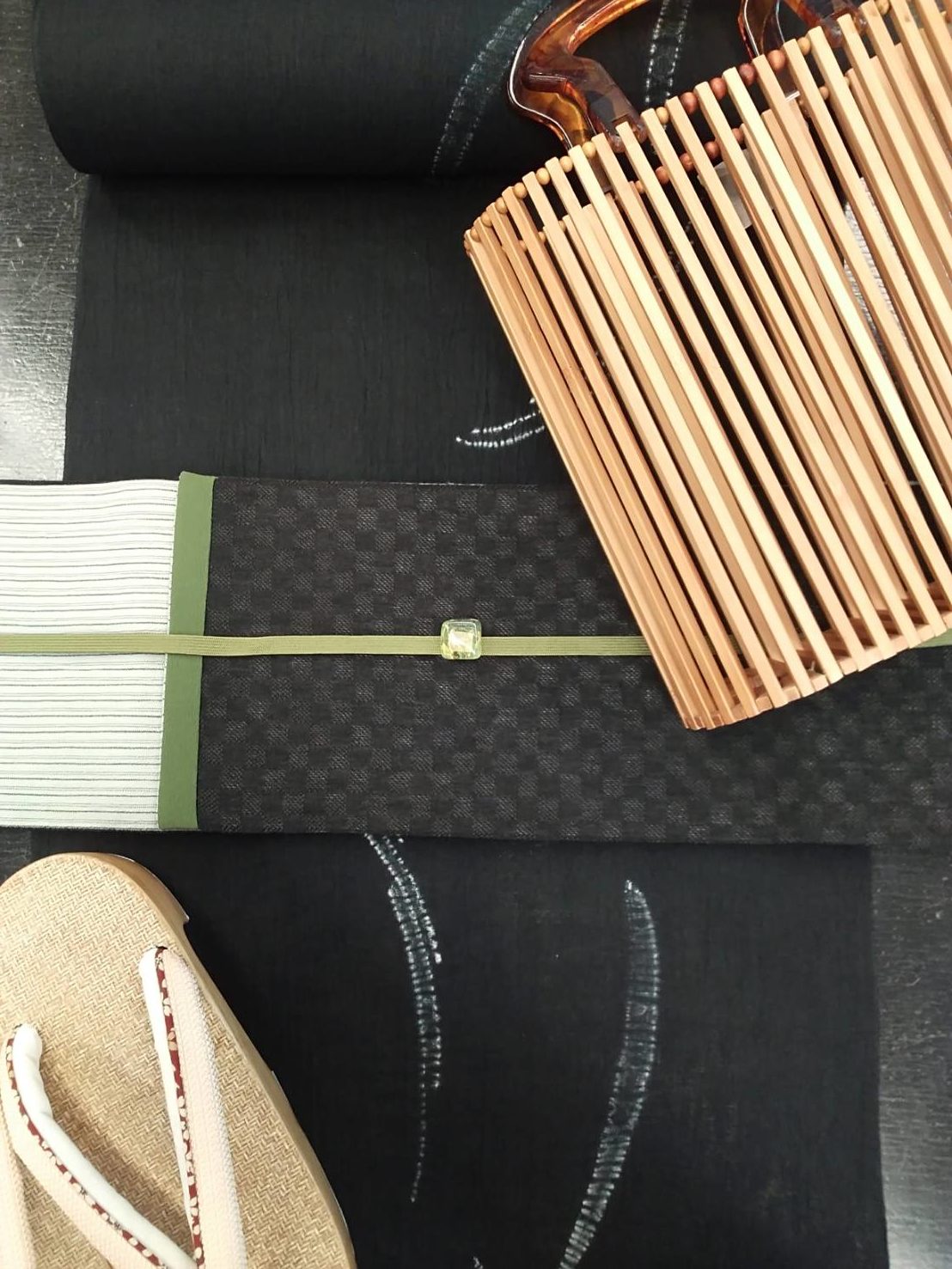 その着物は夏の夜の川辺の草に、帯留は黄色を合わせて蛍に見立てました。