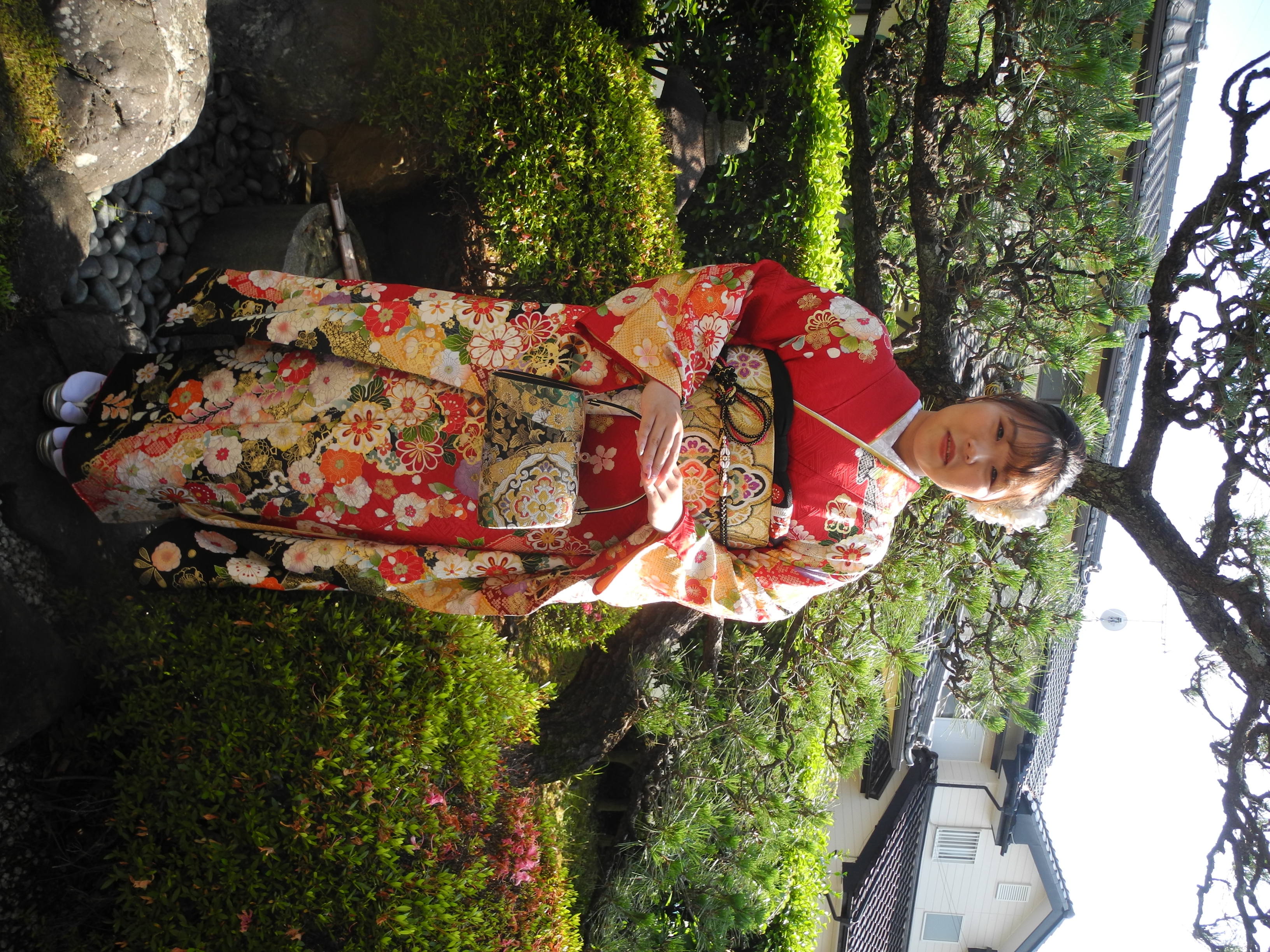 赤地に、カラフルに辻が花や、菊、桜等が華やかに描かれたお振袖に帯や草履バッグは正倉院裂 唐花文様で統一した伝統的コーディネイトしていただいたお嬢さま。