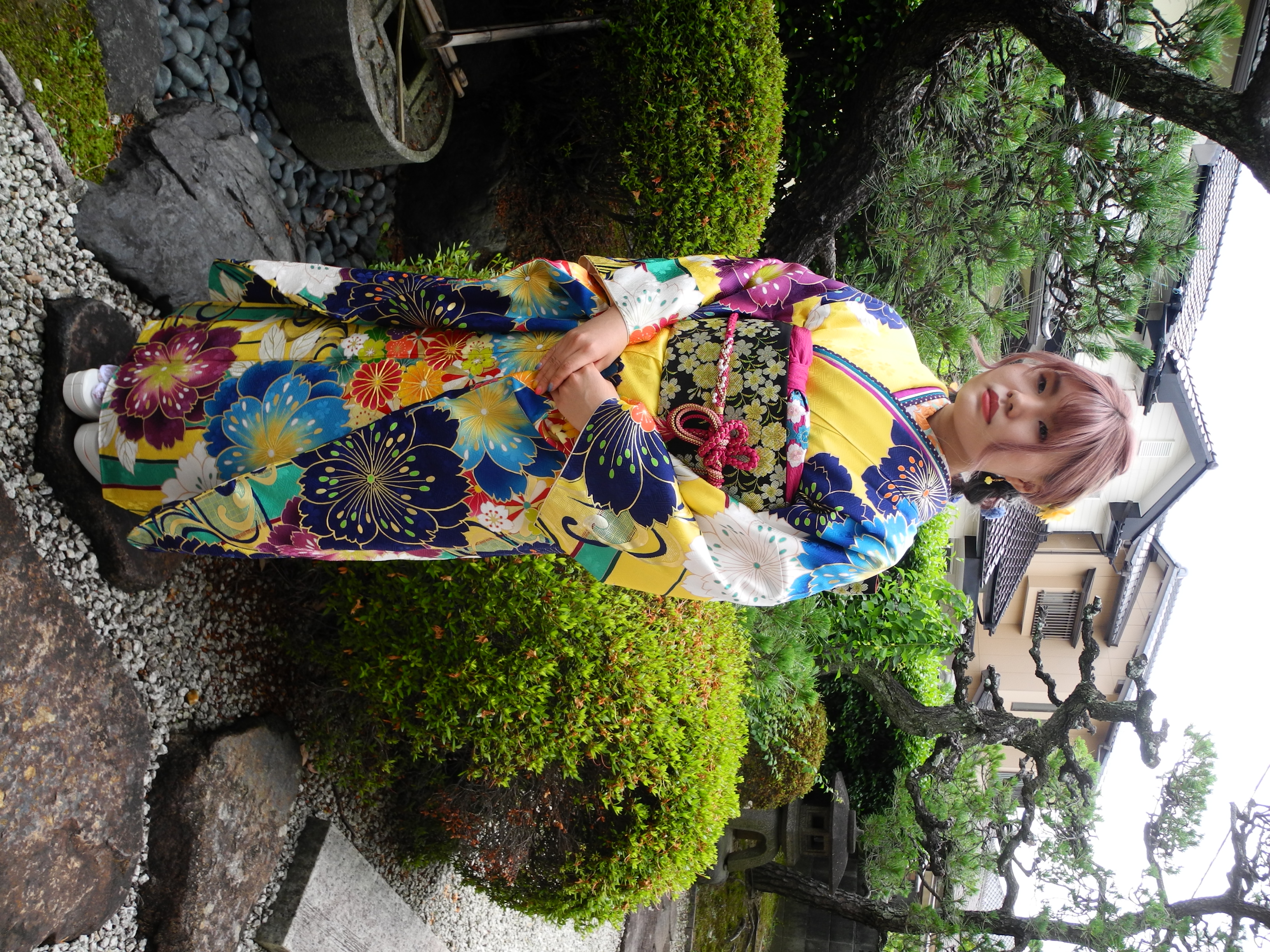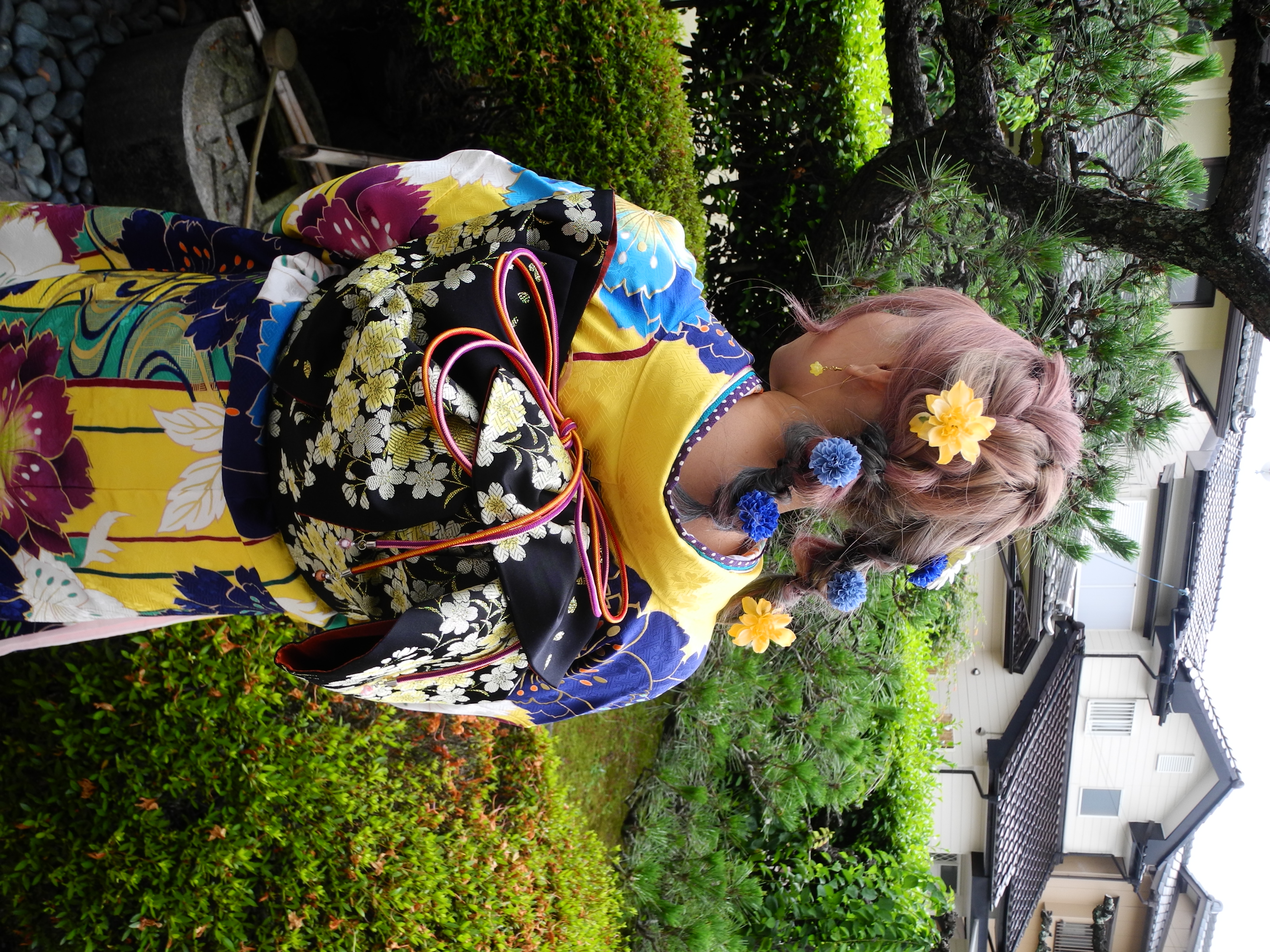髪飾も黄色と青で、お振袖の色に合わせて。