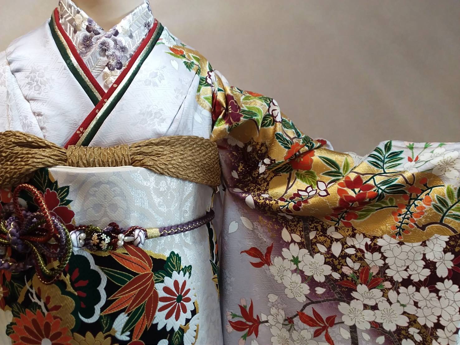菊、梅、竹、松等がお振袖と同じ色合いで描かれた帯があり、コーディネイトしてみました。
