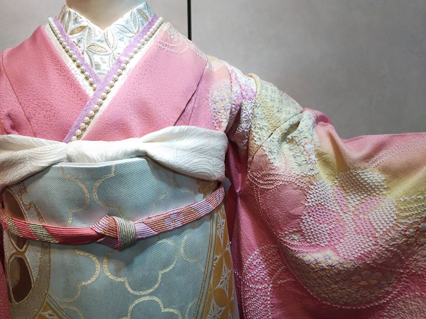 絞りの模様が素敵。青磁鼠色の帯を合わせてふんわり可愛いコーディネイトに💗