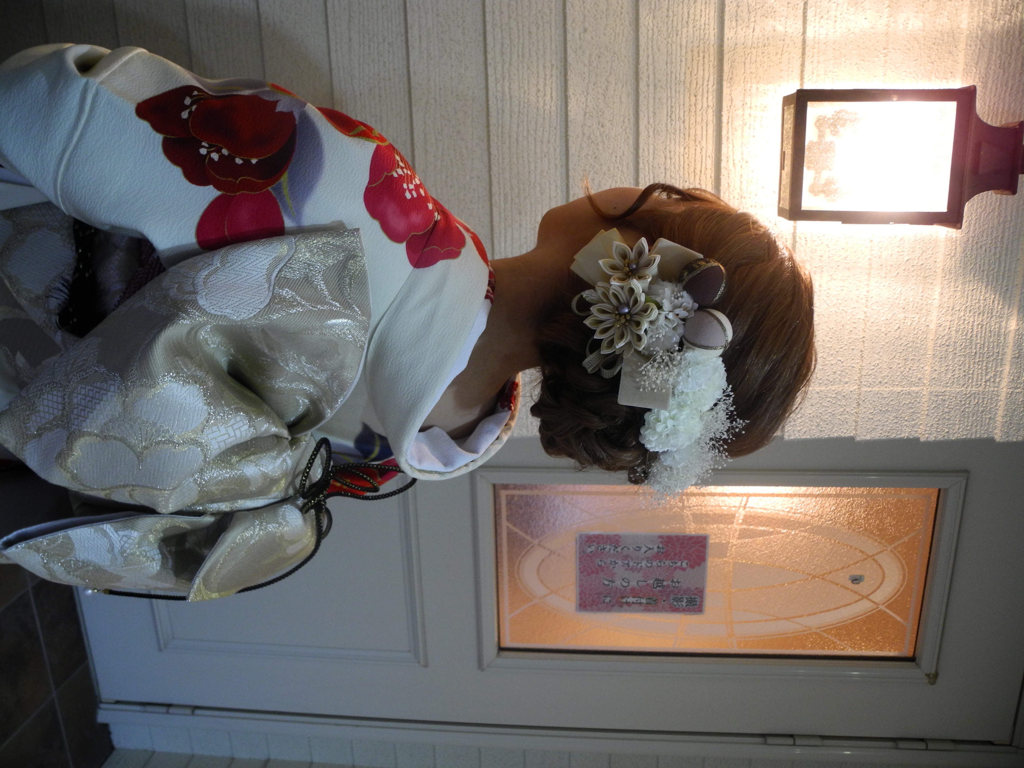 白地のお振袖に合わせて色をグレー系に。白金の髪飾りが良く合います💗