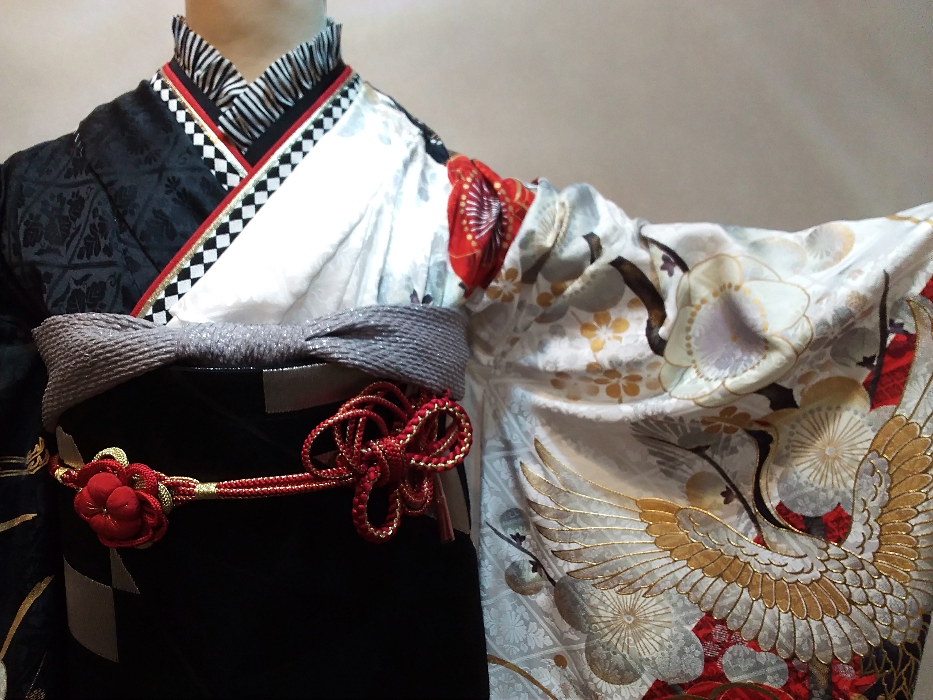 帯揚げの色が一番の悩みどころでした。黒や白、赤だと普通になってしまいそうだったので、グレーを合わせて。