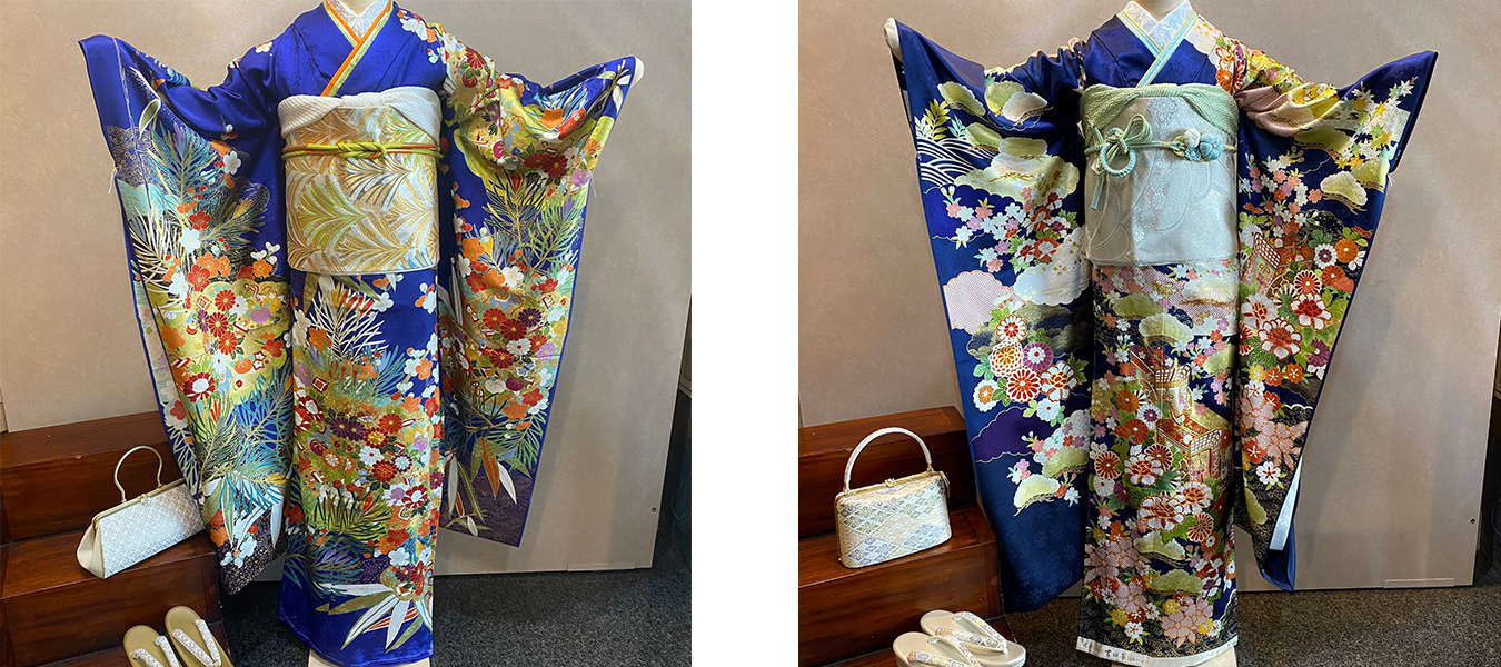 左側は松、雲取、菊とカラフルな色使いが印象的な青色のお振袖。