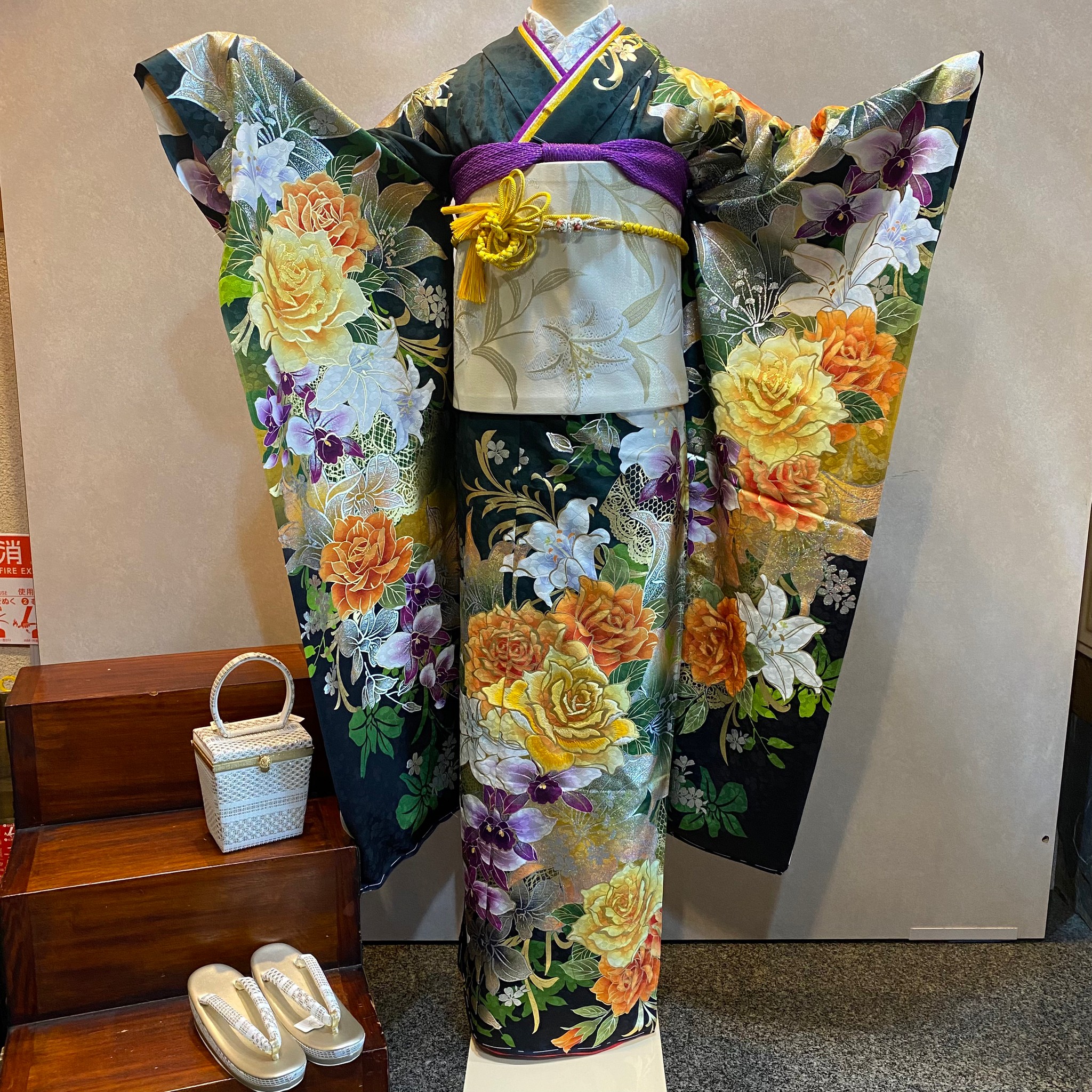 深緑色に洋花柄の振袖。