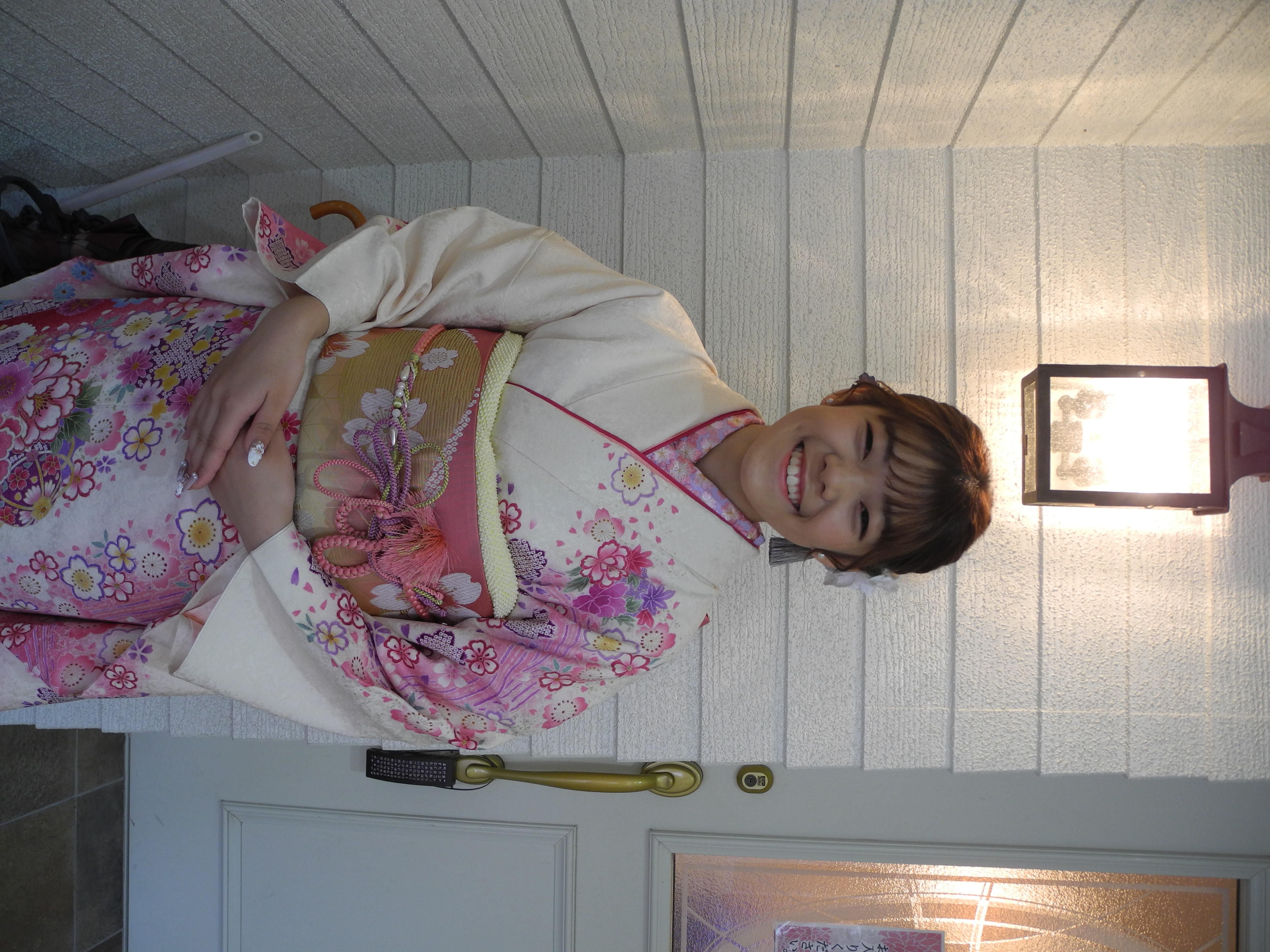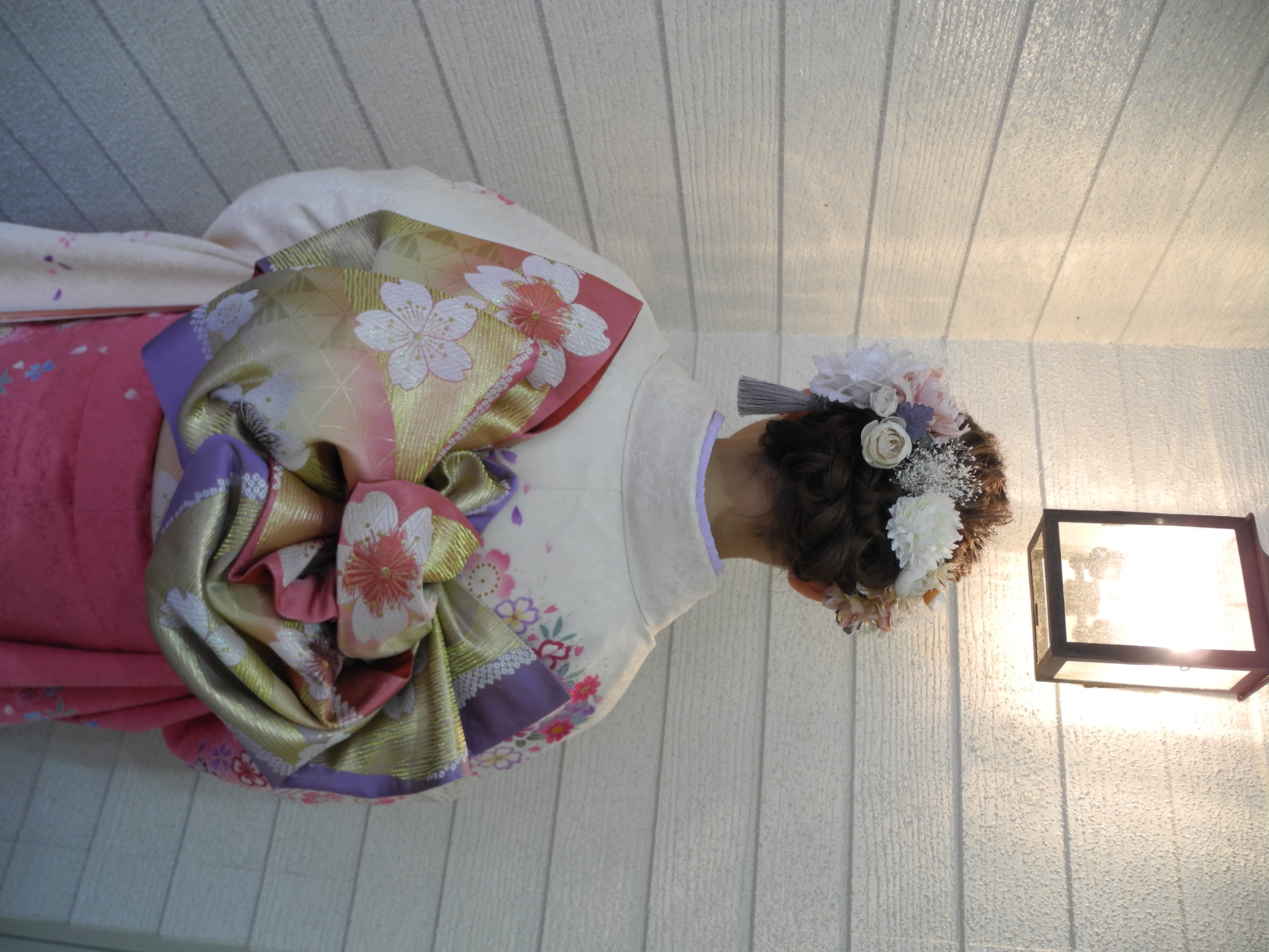 白地にピンクやラベンダーの小花が描かれたお振袖に、小物もピンク、ラベンダー系でまとめて可愛らしい雰囲気にコーディネイトして頂いたお嬢様。
