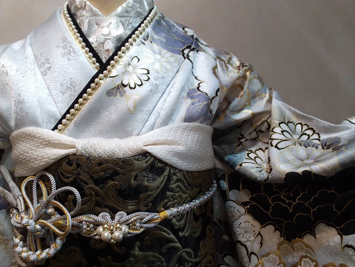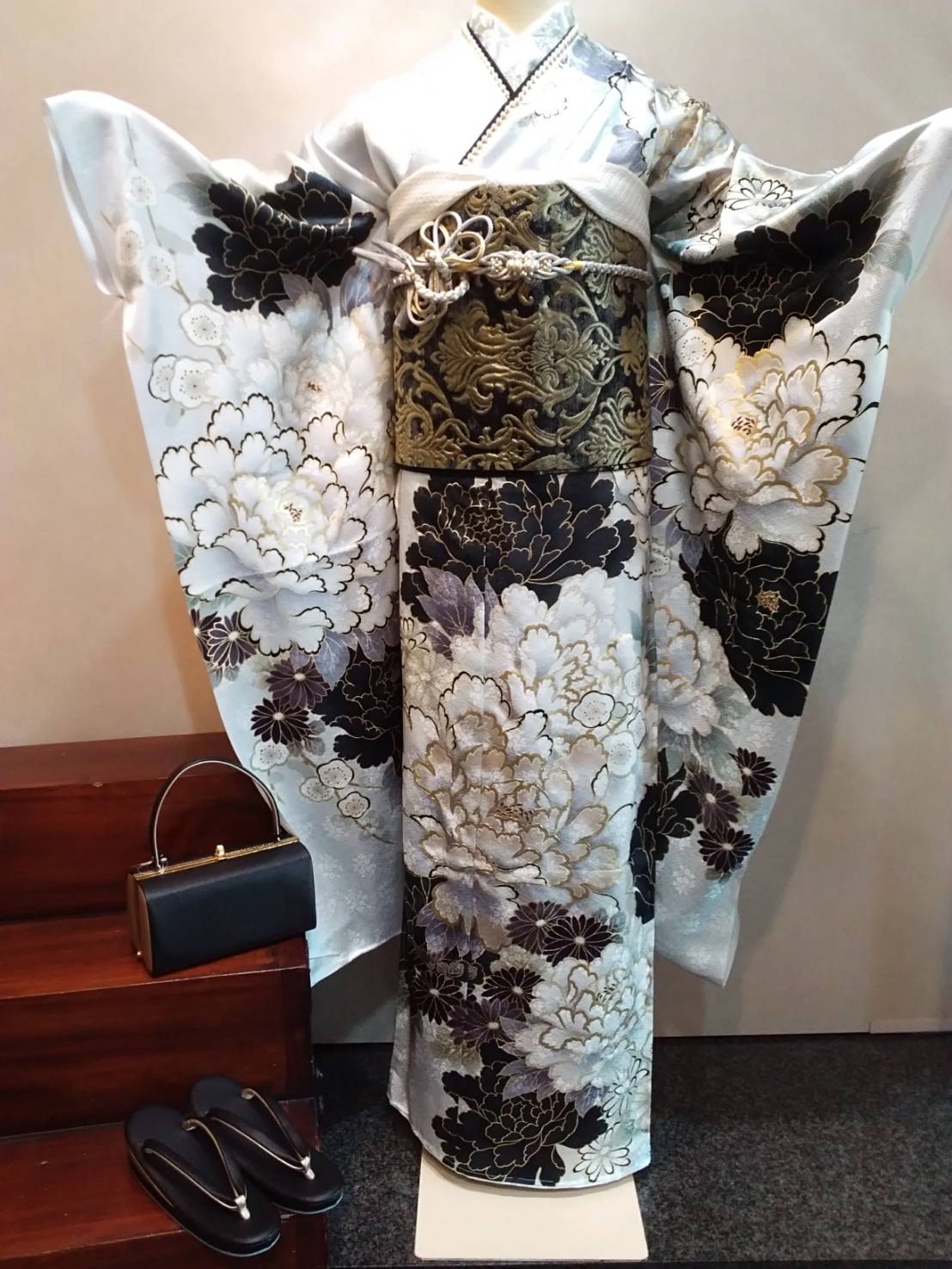 白鼠色(シルバーに近いような薄いグレー)に大きな黒い牡丹や梅、菊がウインタータイプに似合いそうなお振袖です。