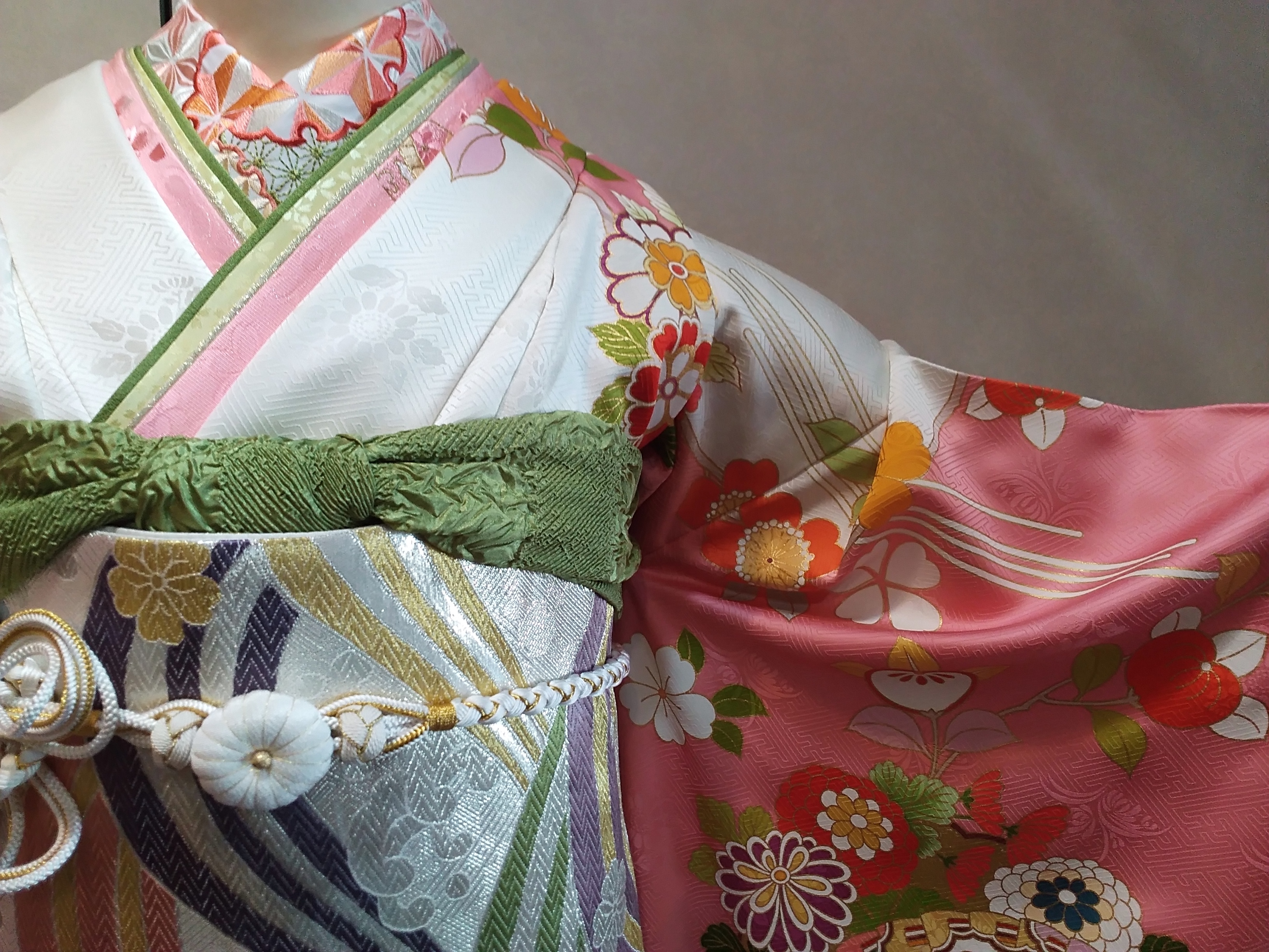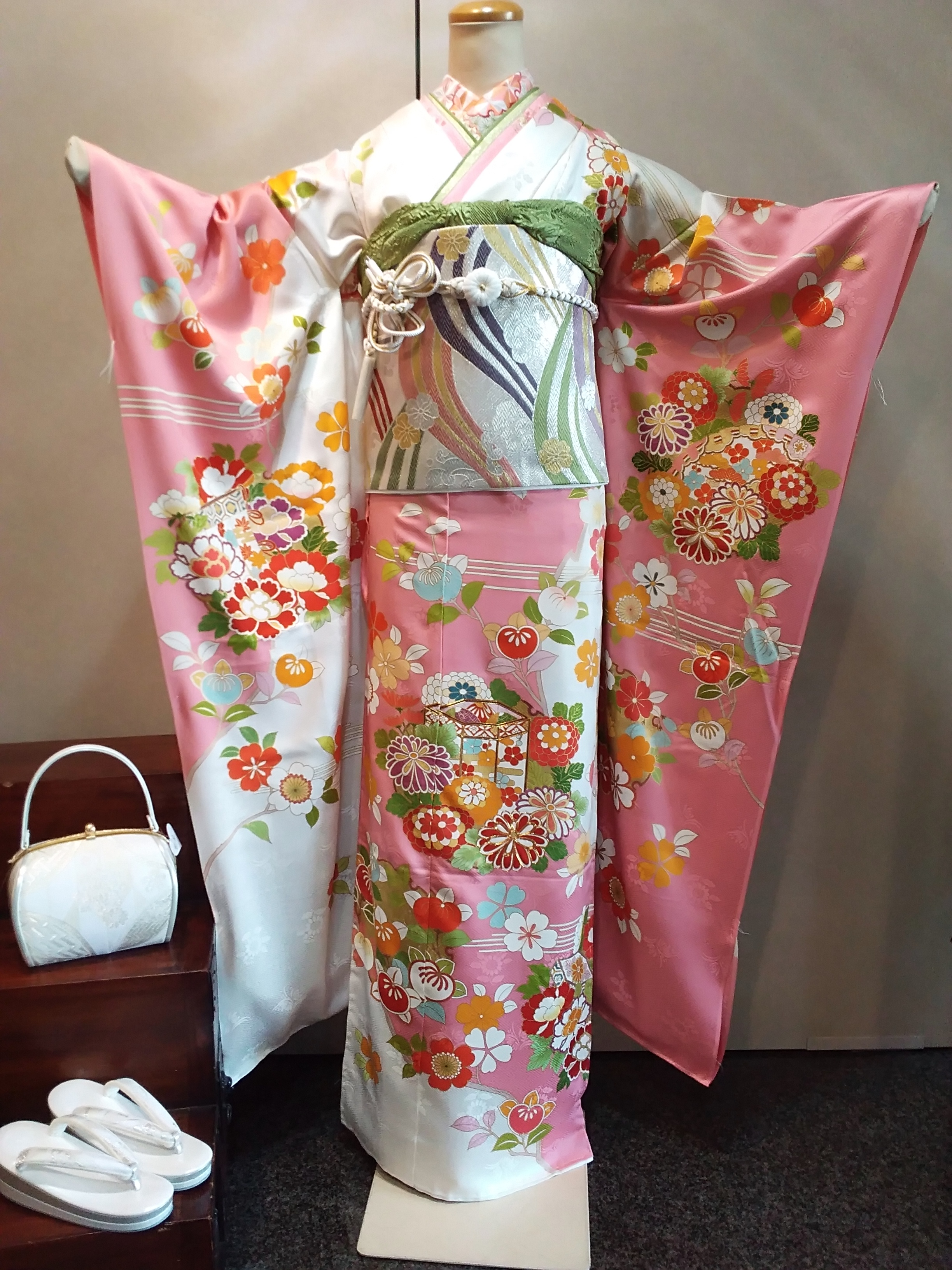 白と桃色の古典柄のお振袖。