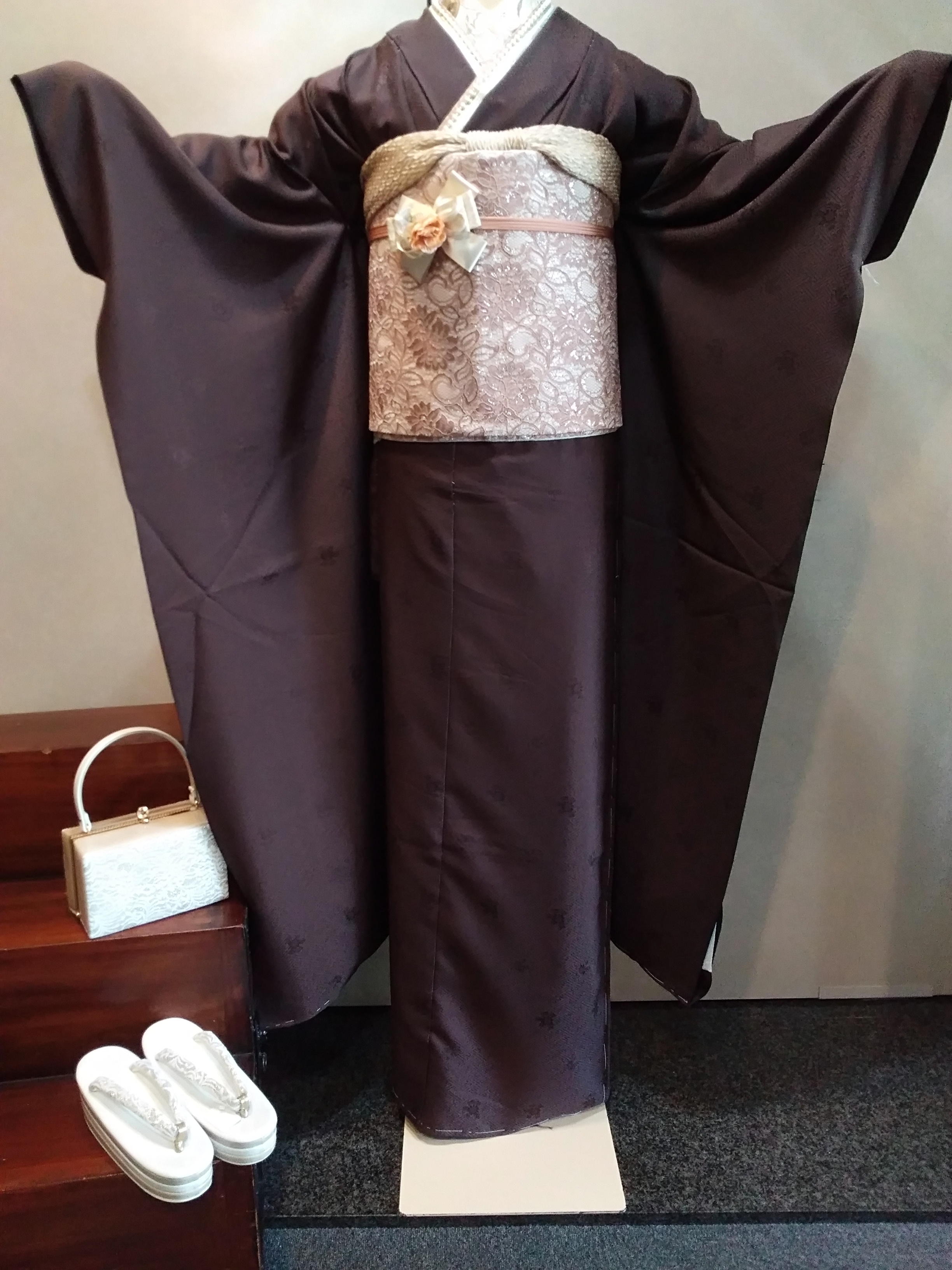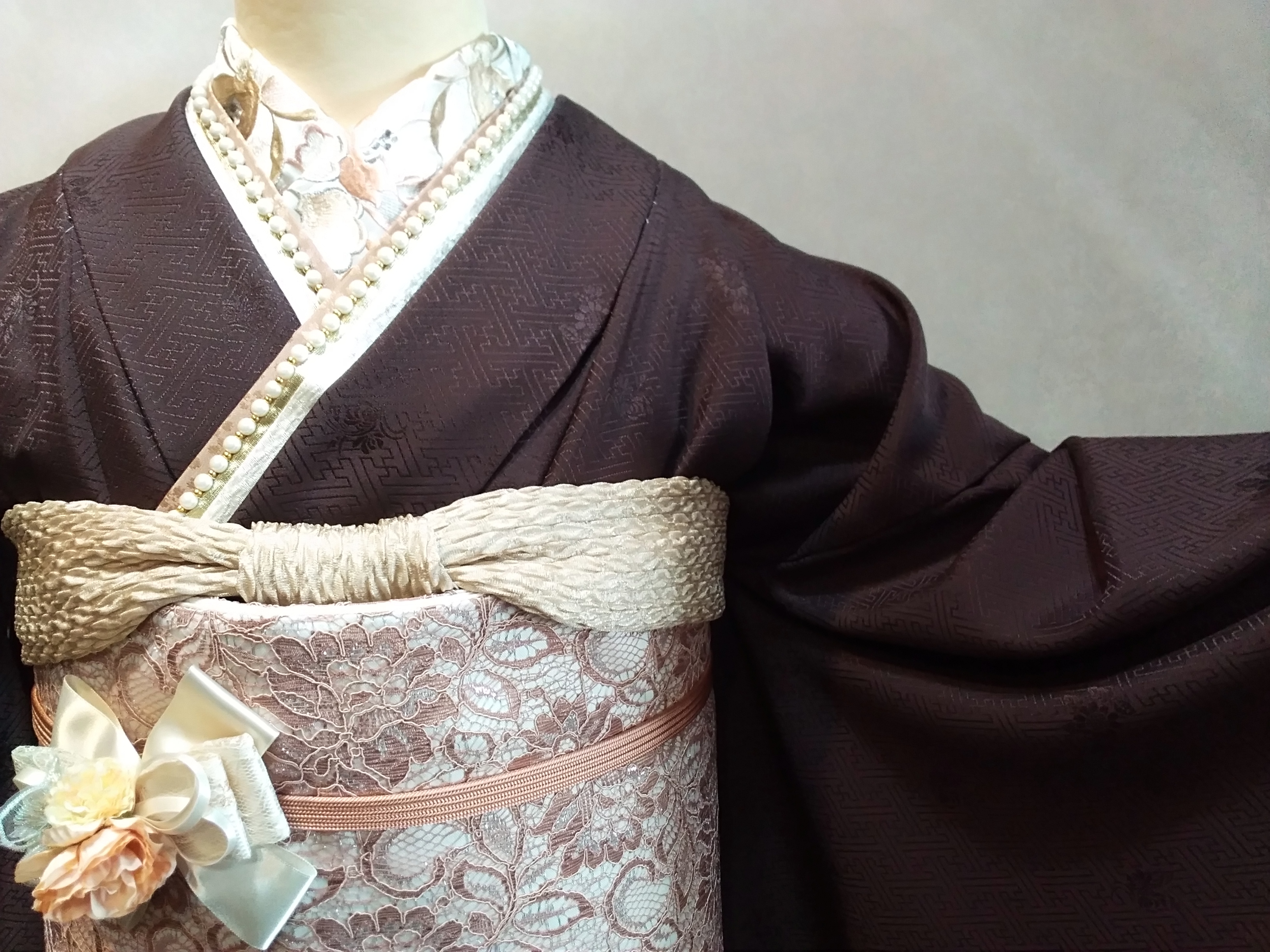 黒茶色の無地のお振袖にレース、パールの小物でコーディネイト。