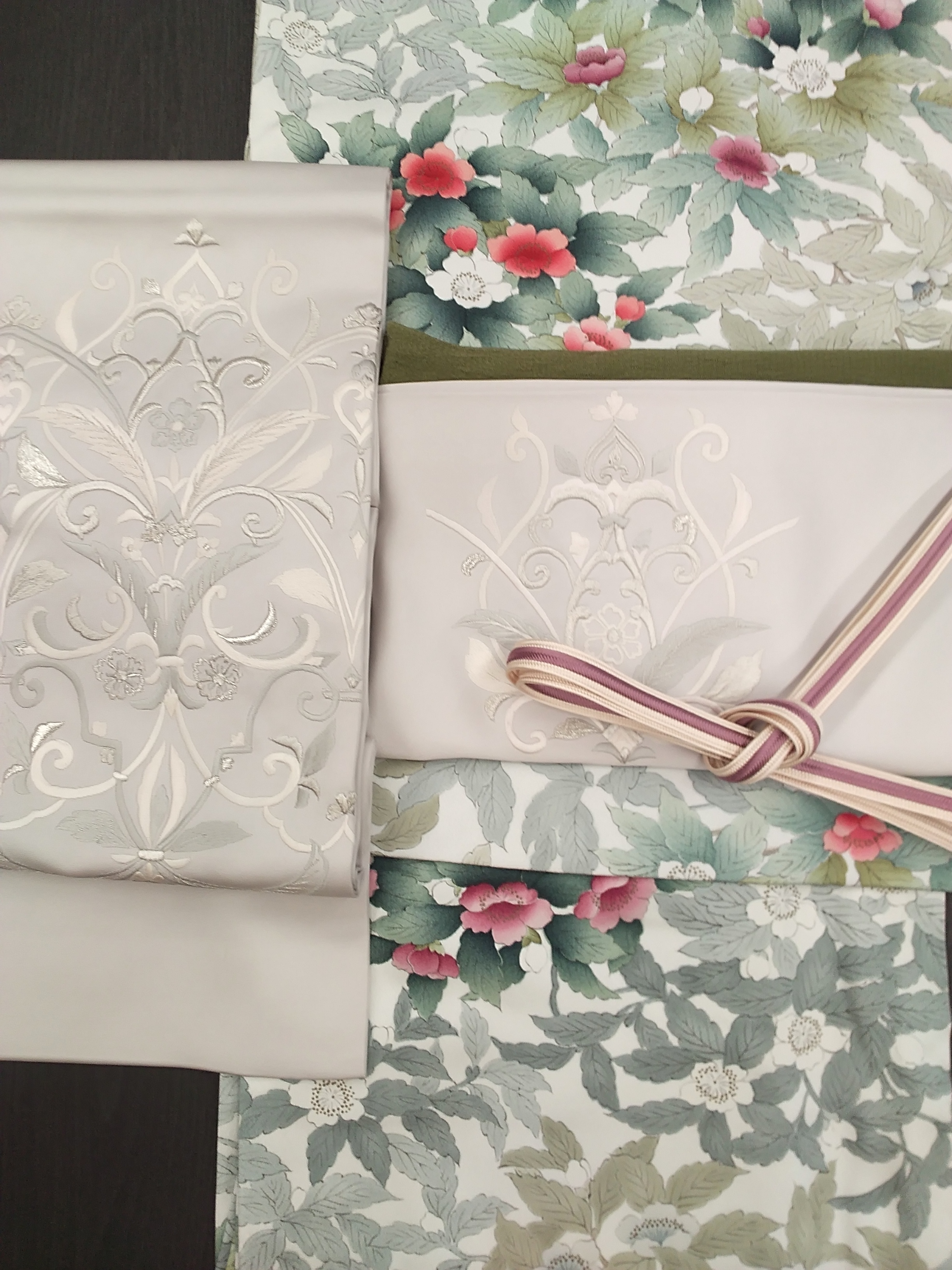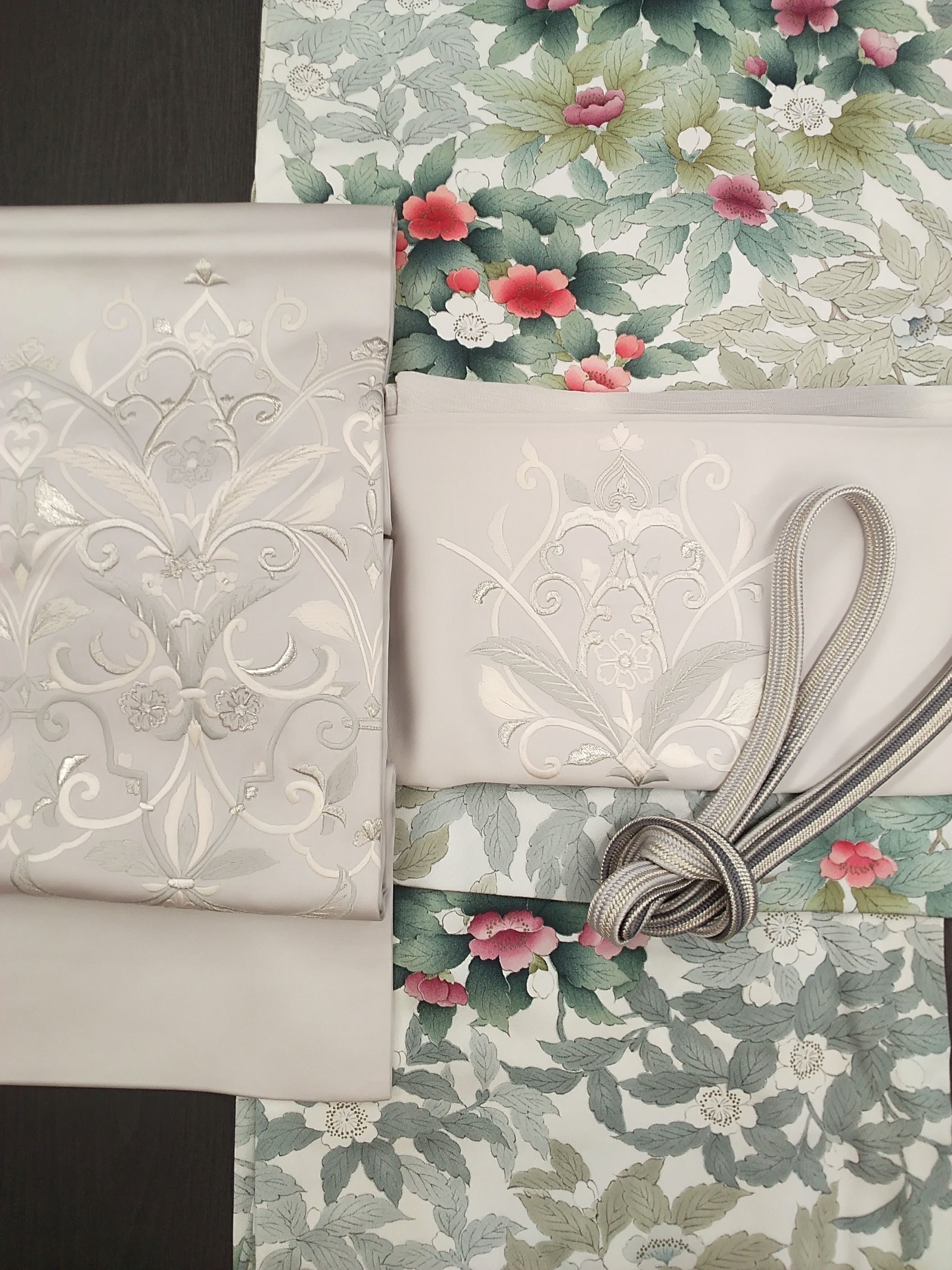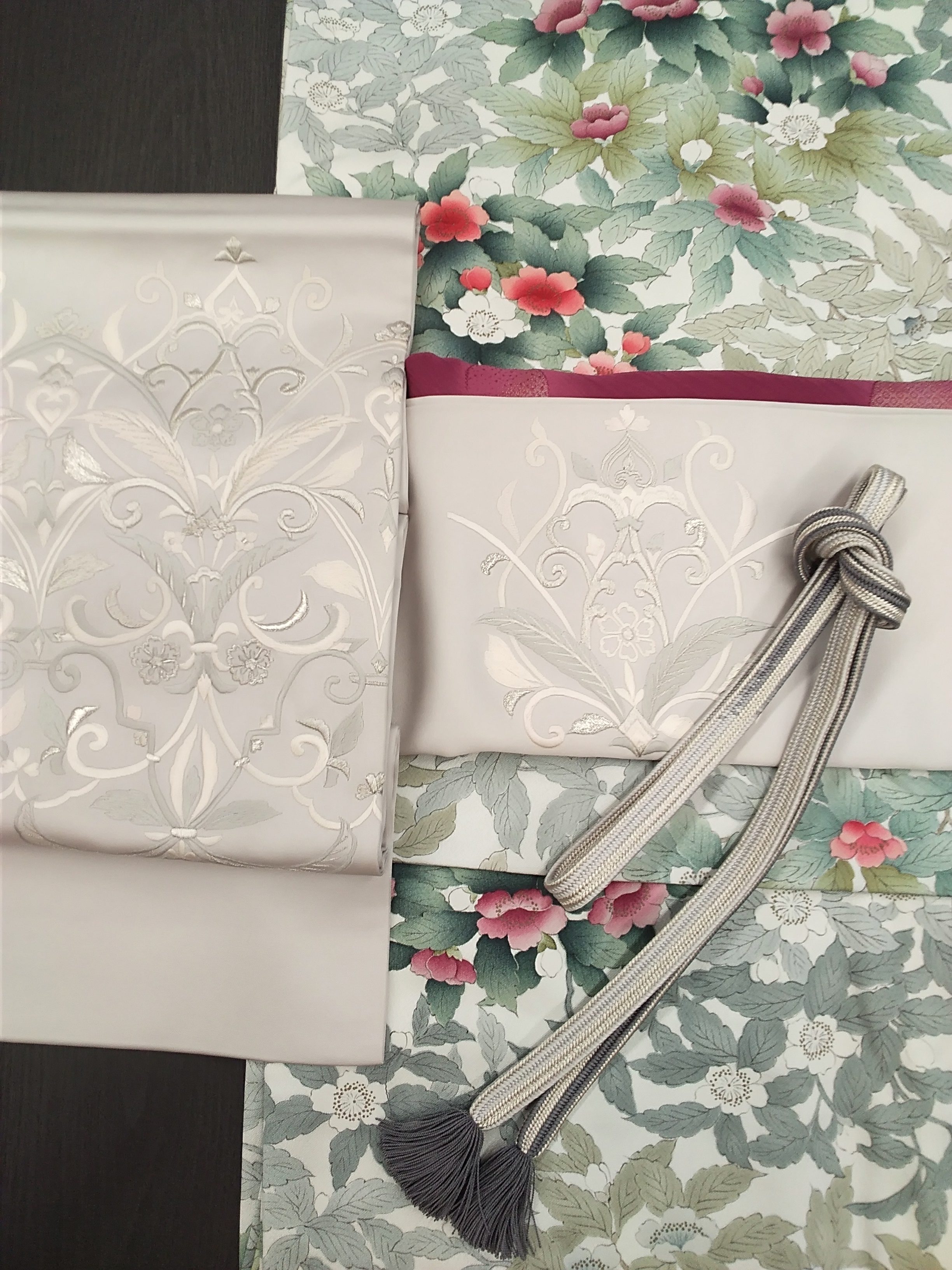 ★帯は抽象的な柄、色数の少ないものを選びます。今回はシルバーの帯。