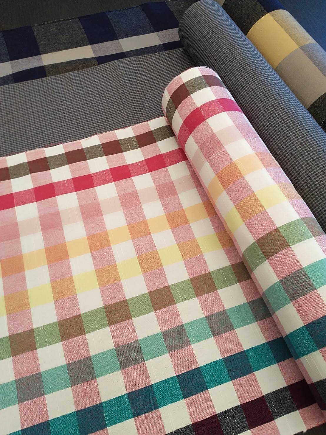 真夏なら浴衣。それ以外の季節は全部この木綿の着物でクリアできます。ブーツやヒール、シャツやハイネック、スカートなどを着て和洋ミックスにするのも可愛いです。先に染めた糸から織っているので、チェックやストライプが多いですね。