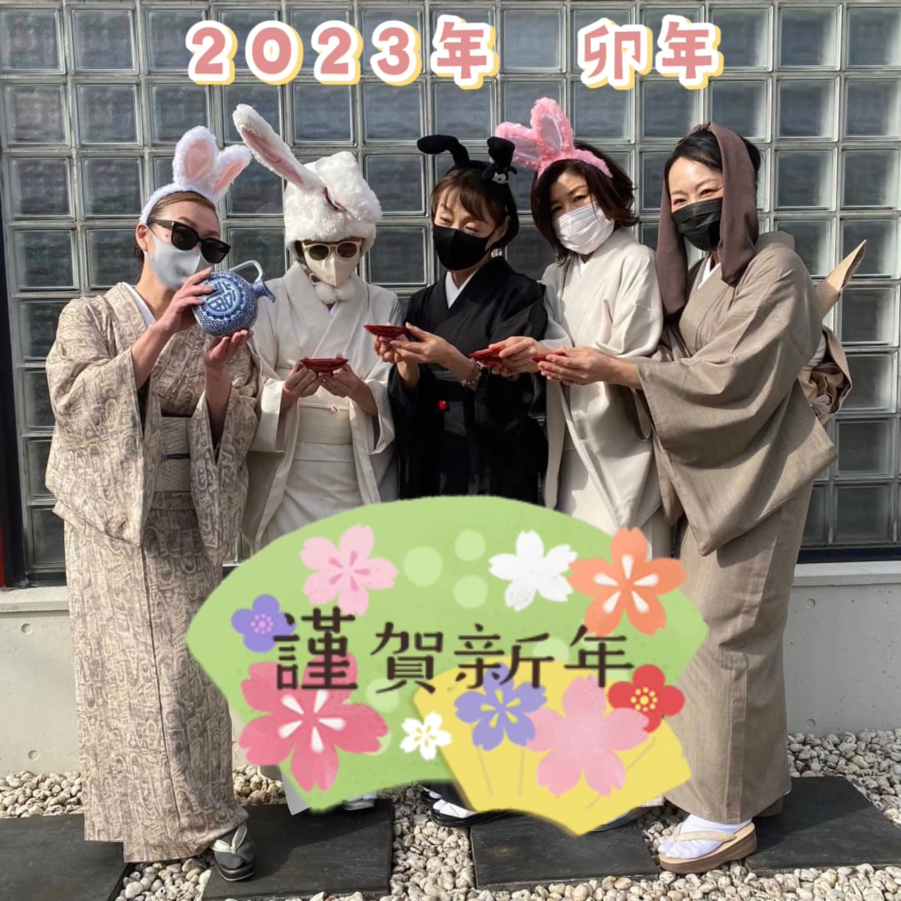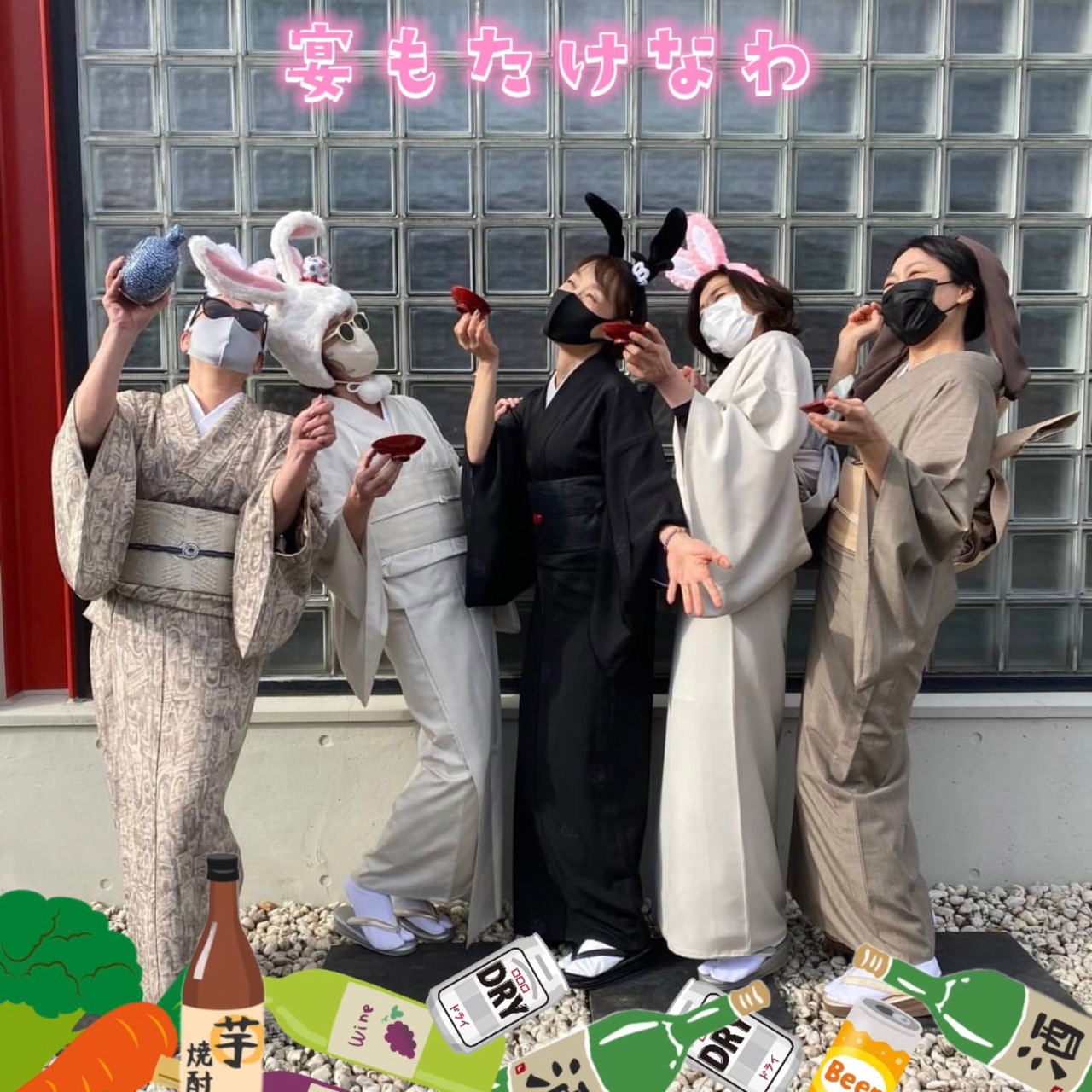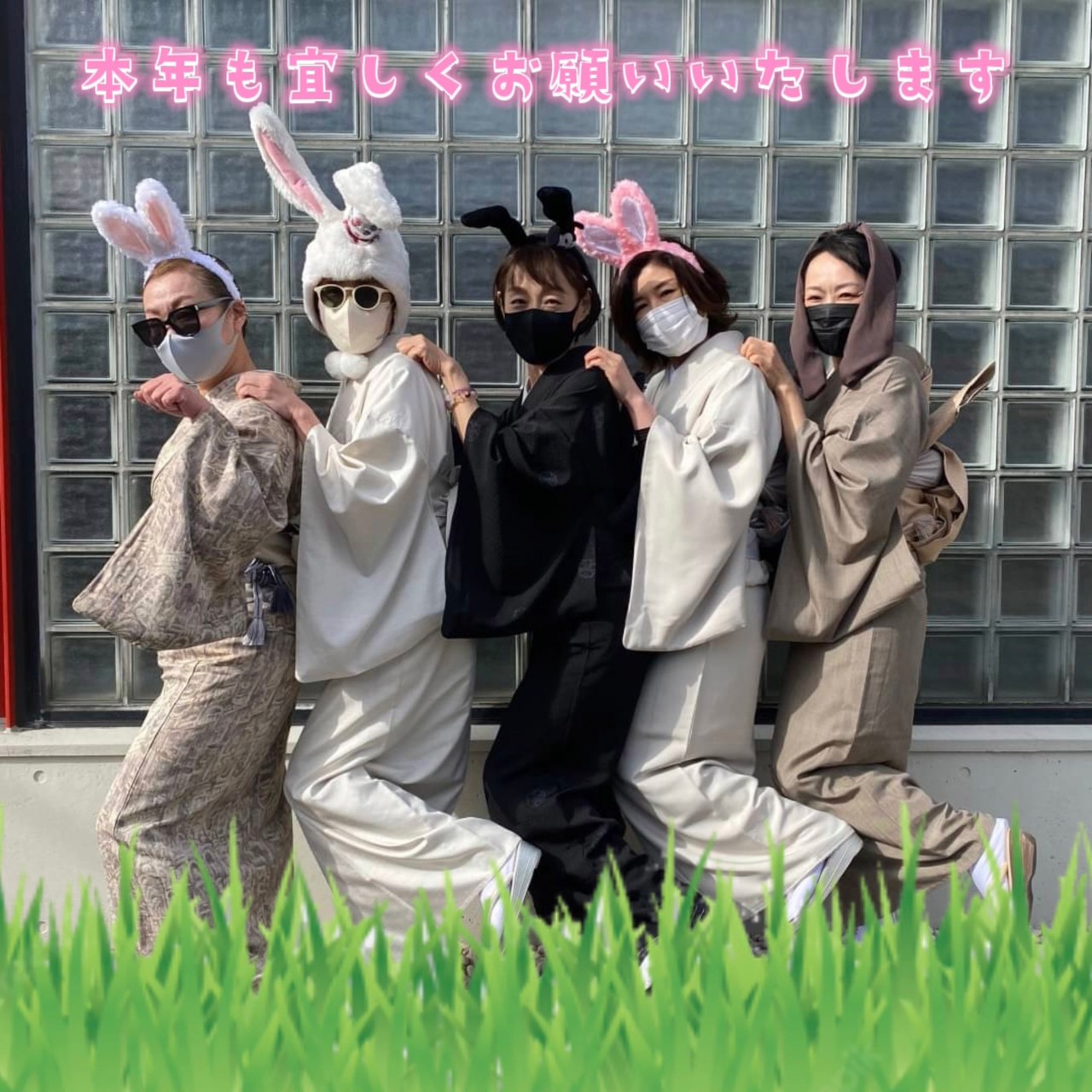 うさぎ年という事で、まだらウサギ、白うさぎ、黒兎、灰色うさぎ、ベージュ色たれ耳うさぎ、になりきってコスプレです。