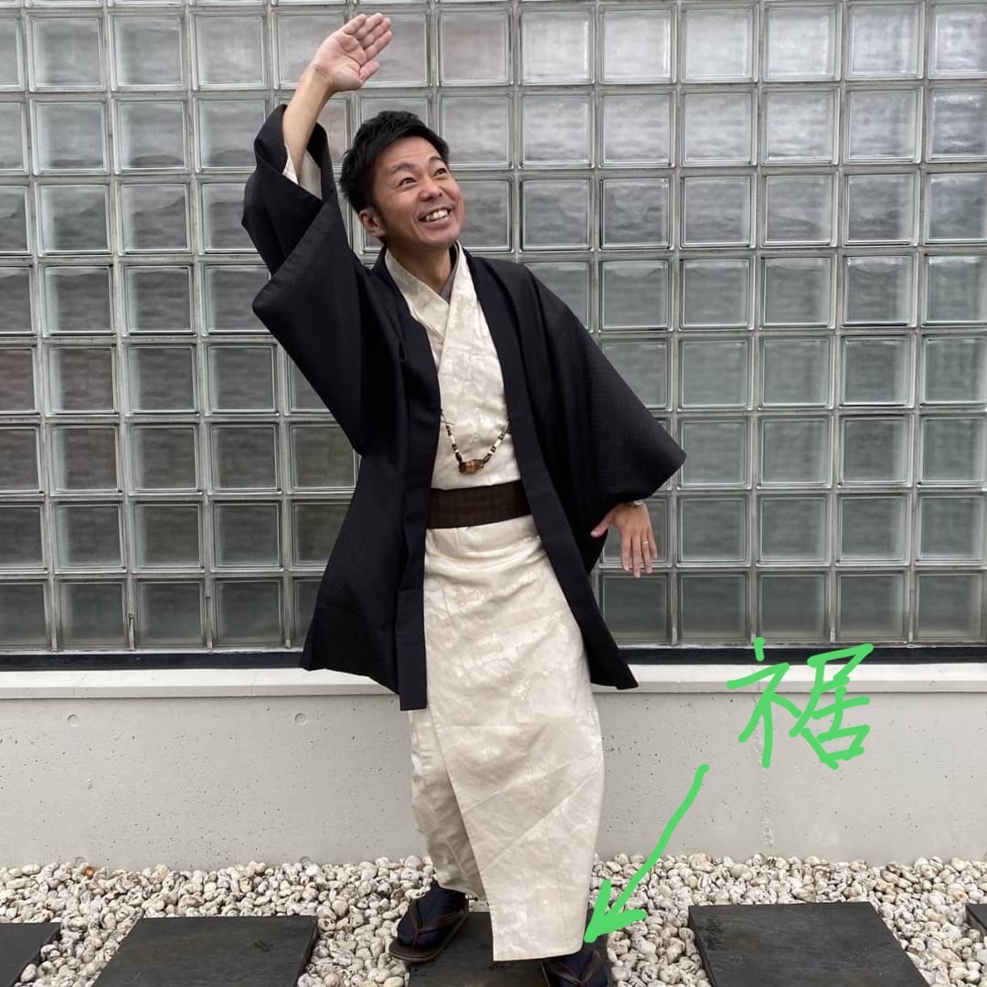 衣服の下の縁の足にあたる部分を裾と呼びます。