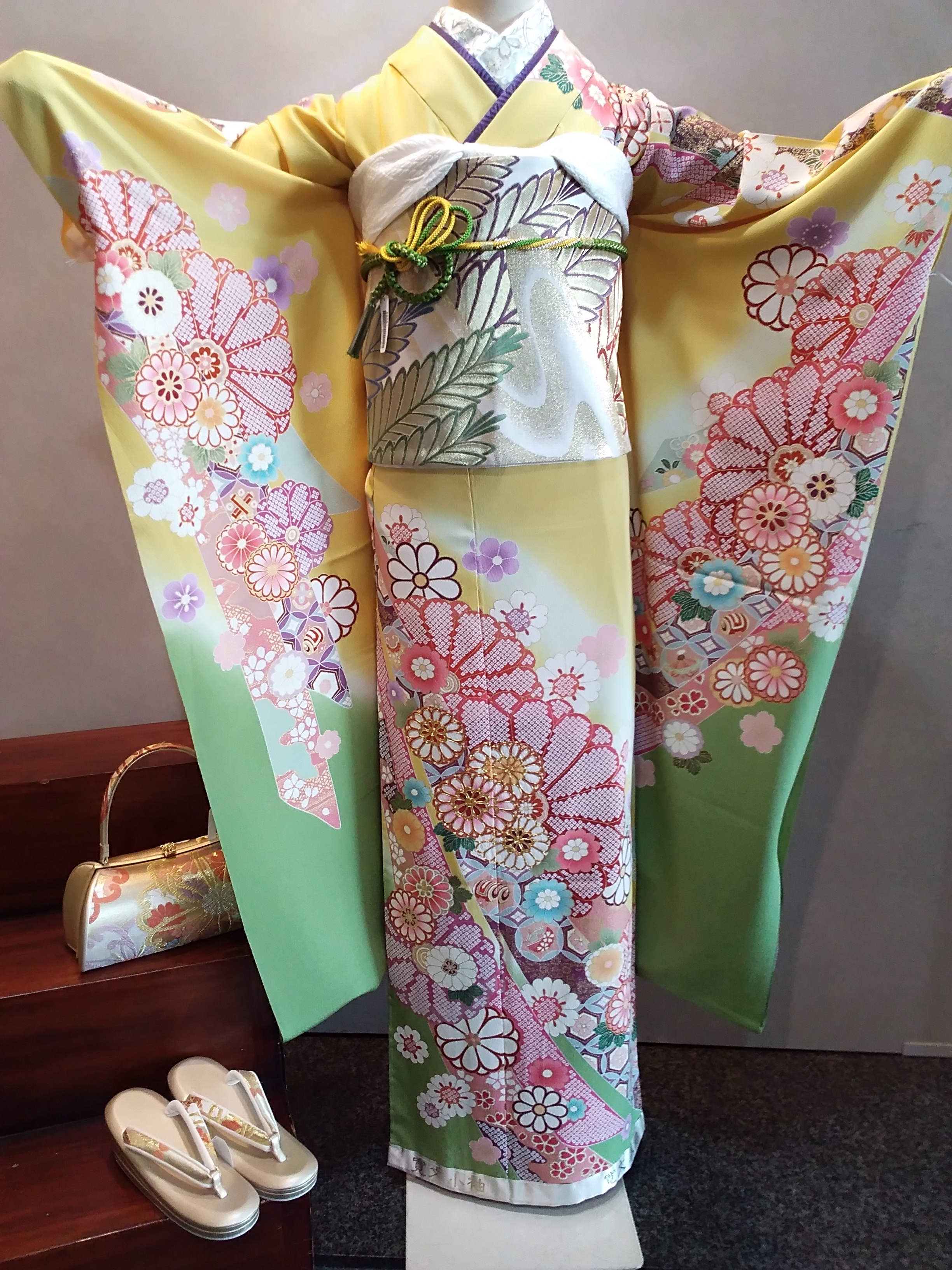 蒲公英色に菊、熨斗、宝尽くしが描かれたお振袖。