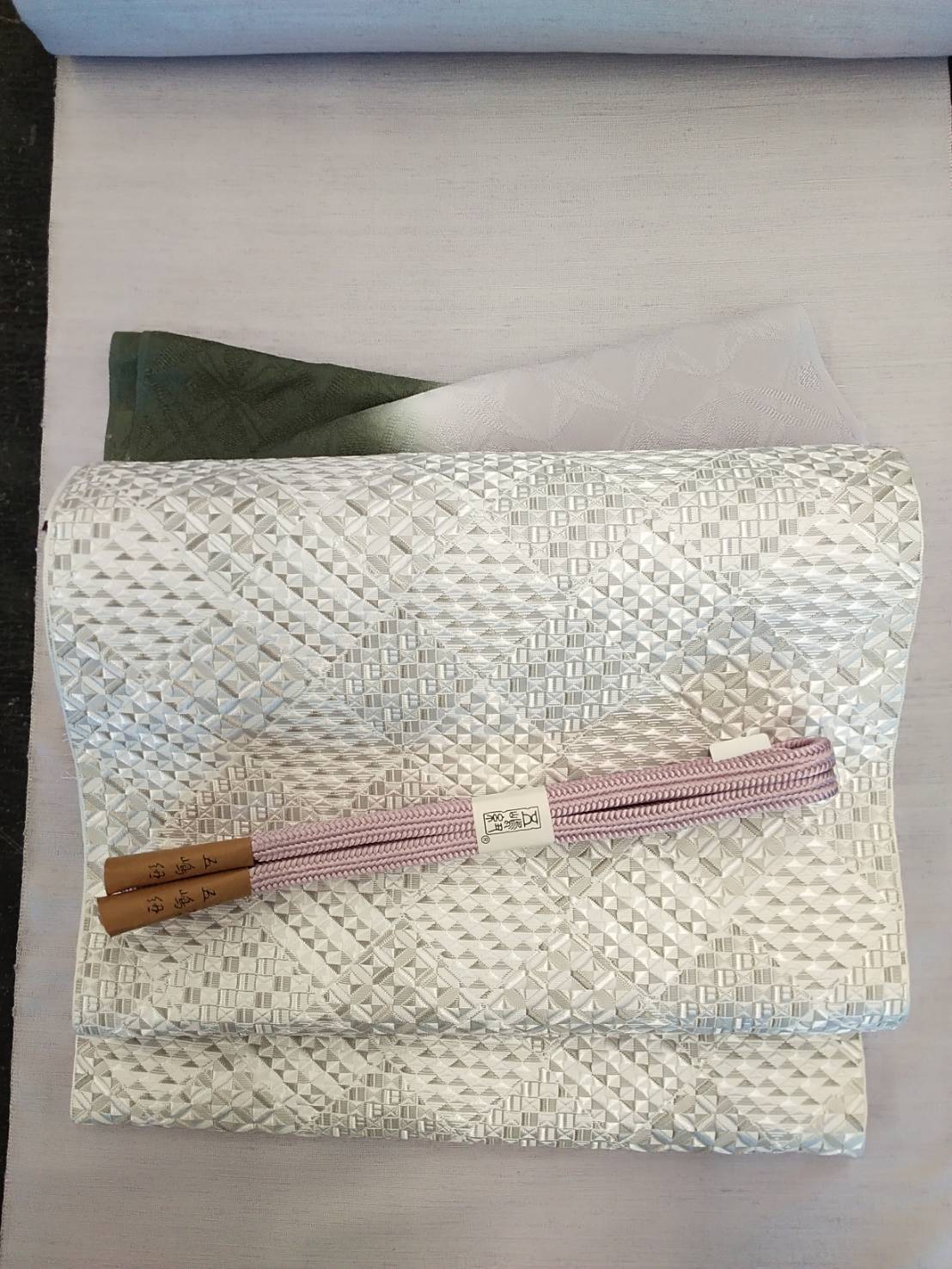 ②藤色の帯締めに、藤色と深緑の2色使いの帯揚げを合わせて、藤の花のイメージ。4月の装い。