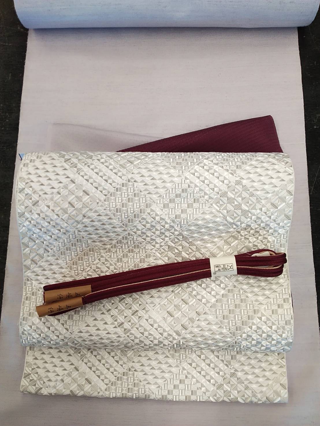 ③藤色とワインレッドの帯揚げに、ワインレッドの帯締めを合わせて、赤ワインを想像させる色使いに。10月の装い。