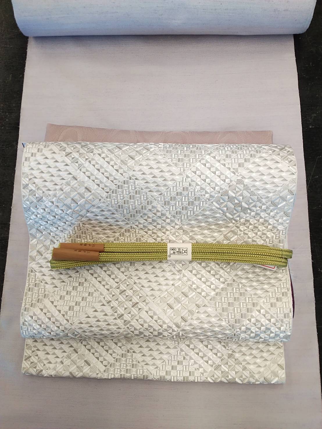 ①若草色の帯締めと渋いピンクの帯揚げを合わせて桜をイメージ。3月の装い。