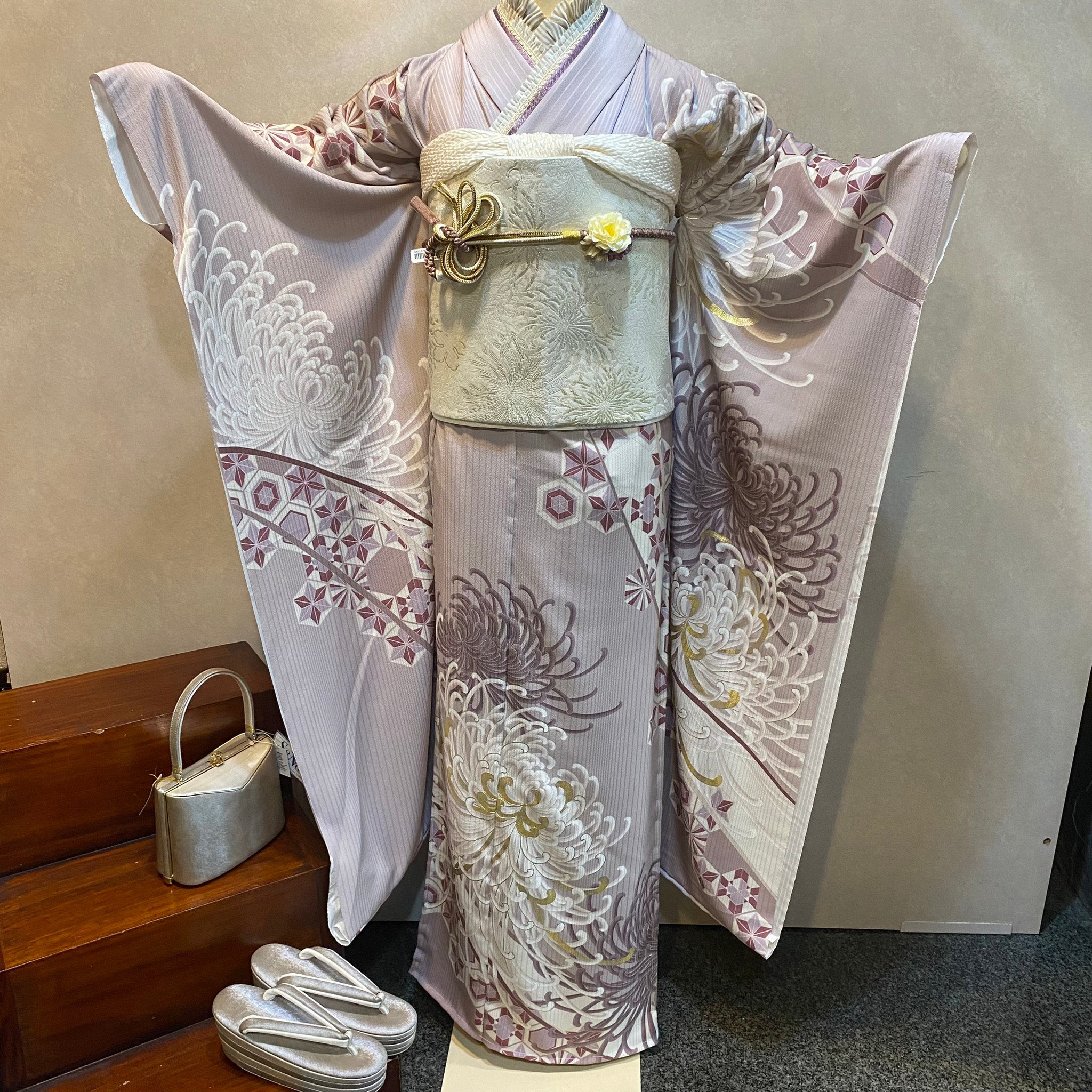 淡紅藤色に乱菊と亀甲、麻の葉が描かれたお振袖。