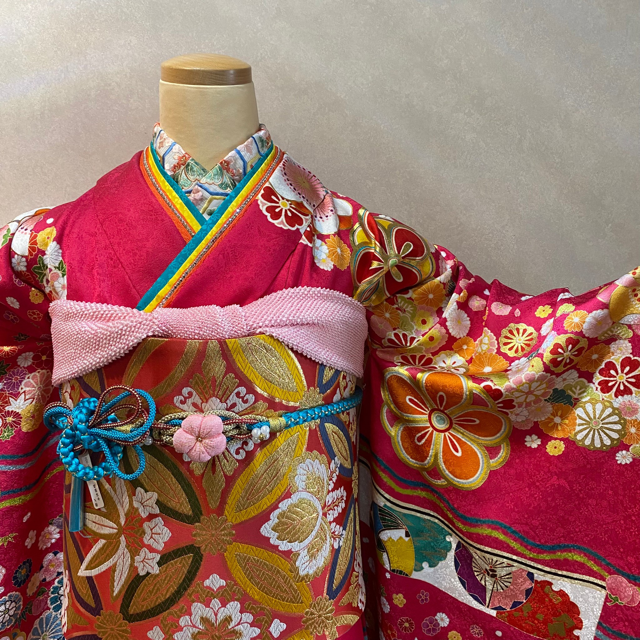 躑躅色のお振袖に、梅や菊がふんだんに描かれてとてもポップな印象ですね。