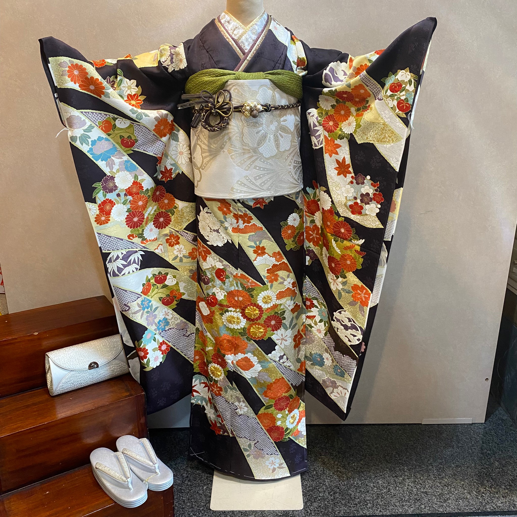 熨斗や、縁起のよい花々が描かれた高級感のあるお振袖です。