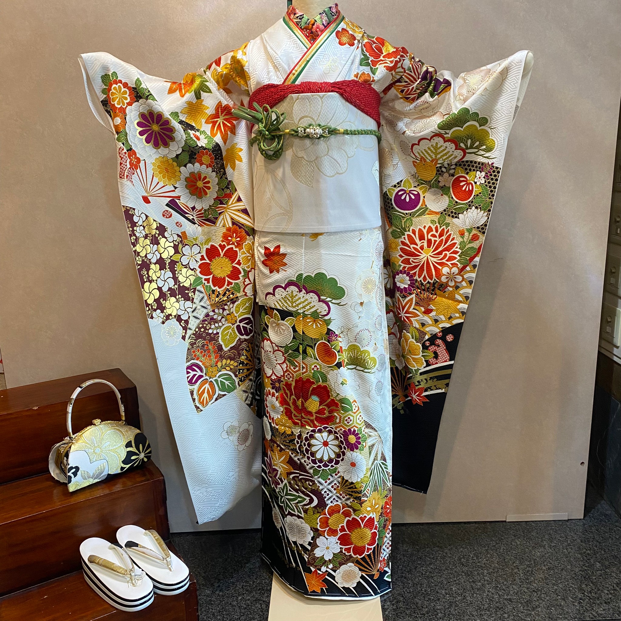 白地に裾が黒になり、扇に菊、桐、橘、松、椿が描かれたお振袖。