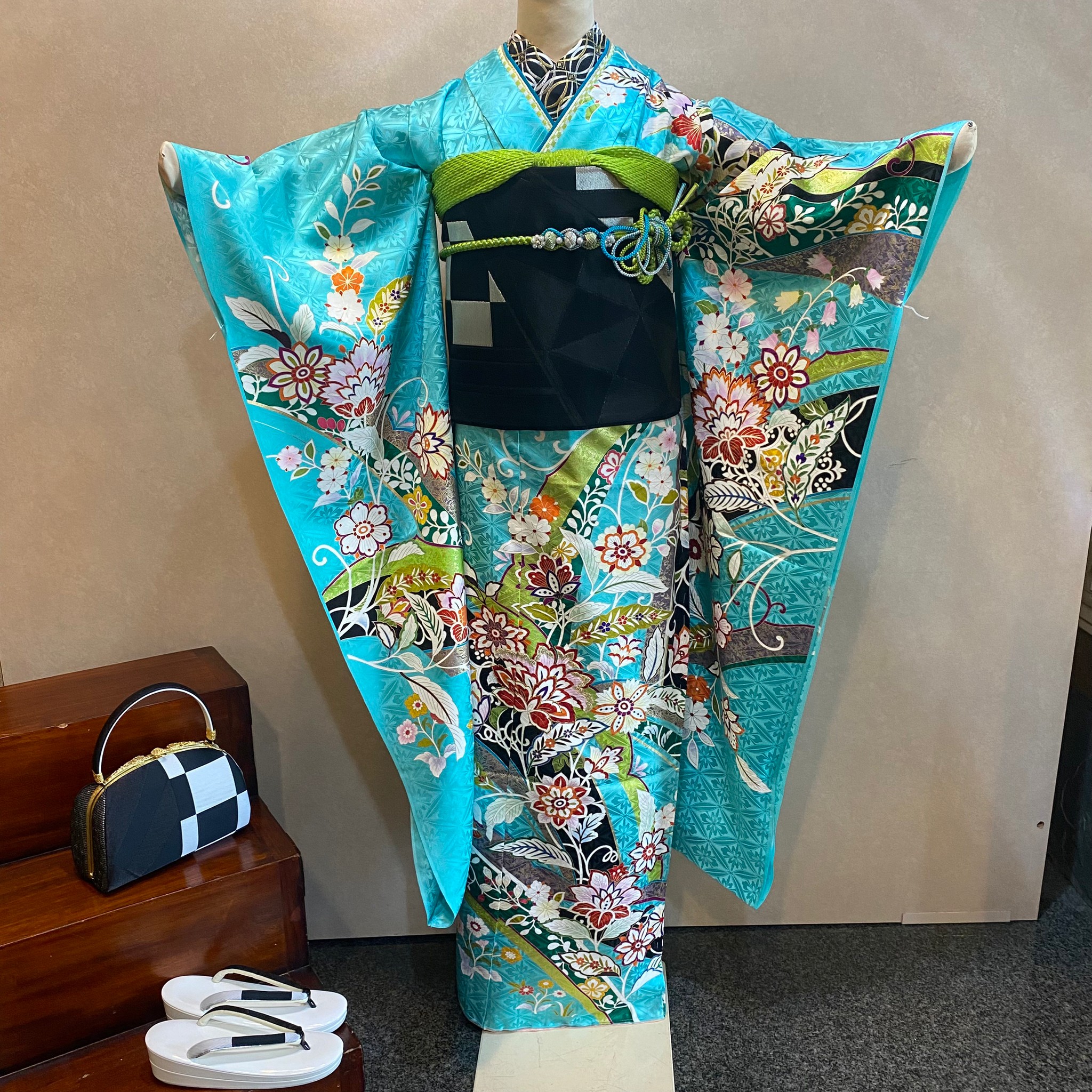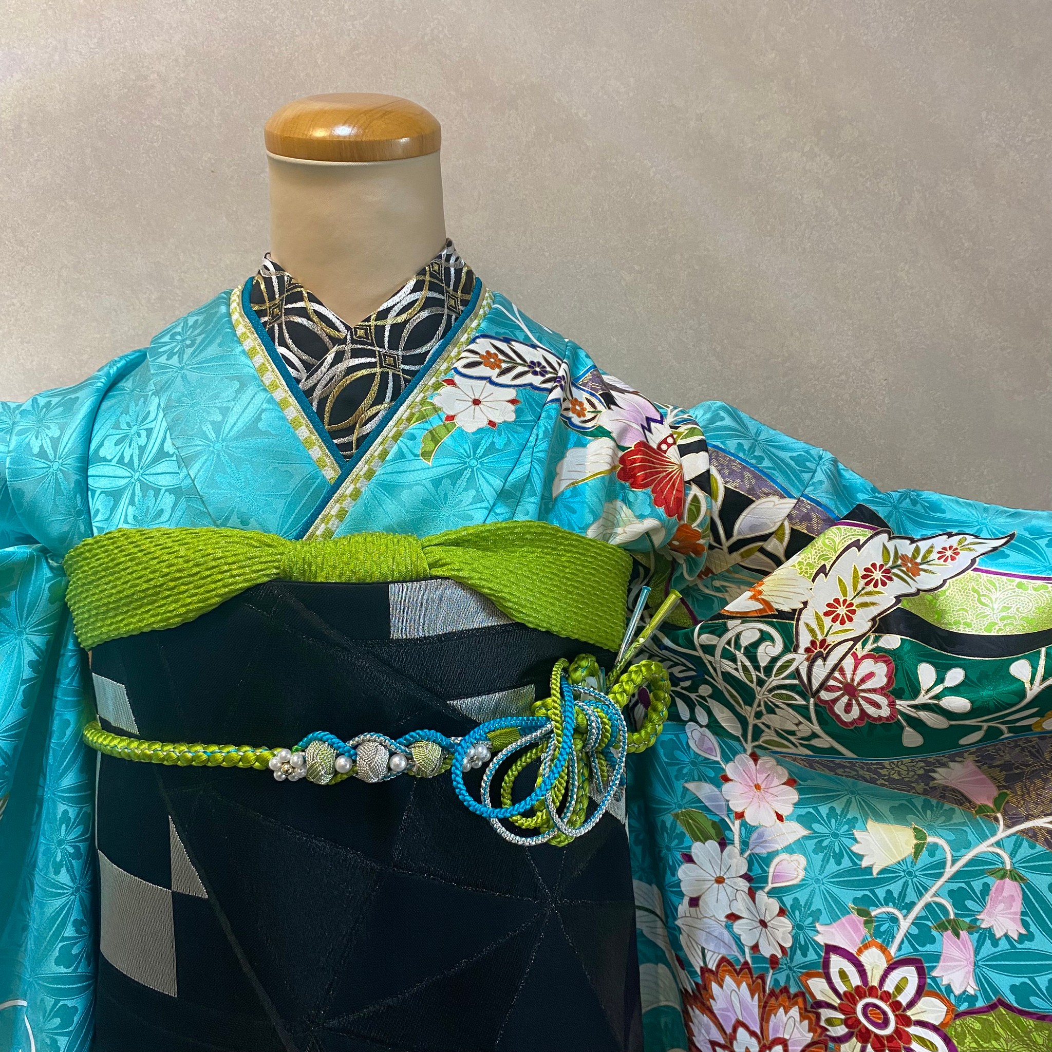 ビビットカラーの水色に、黄緑と黒が効いたお振袖なので、小物も効き色を使ってコーディネイトしてみました。