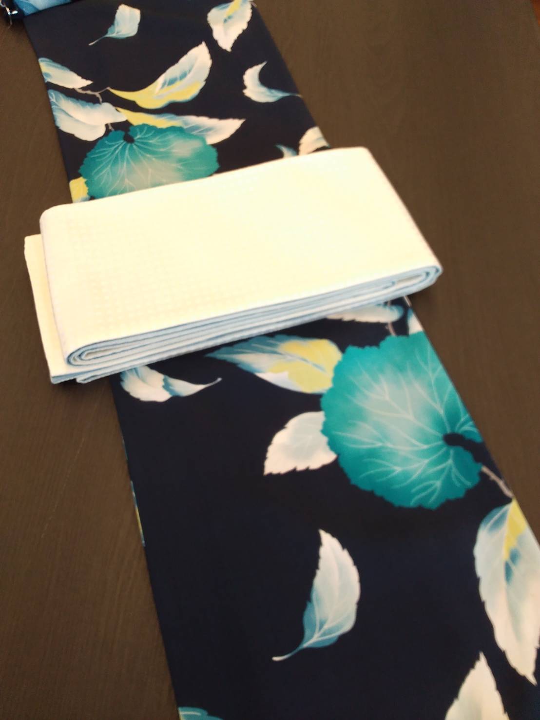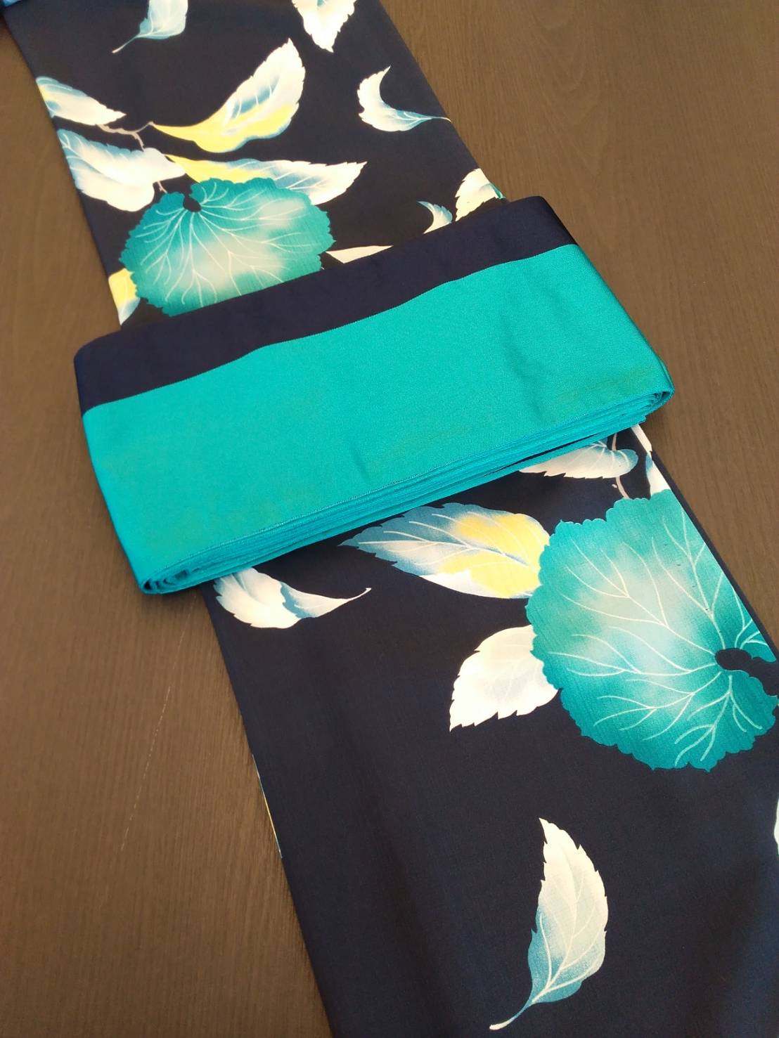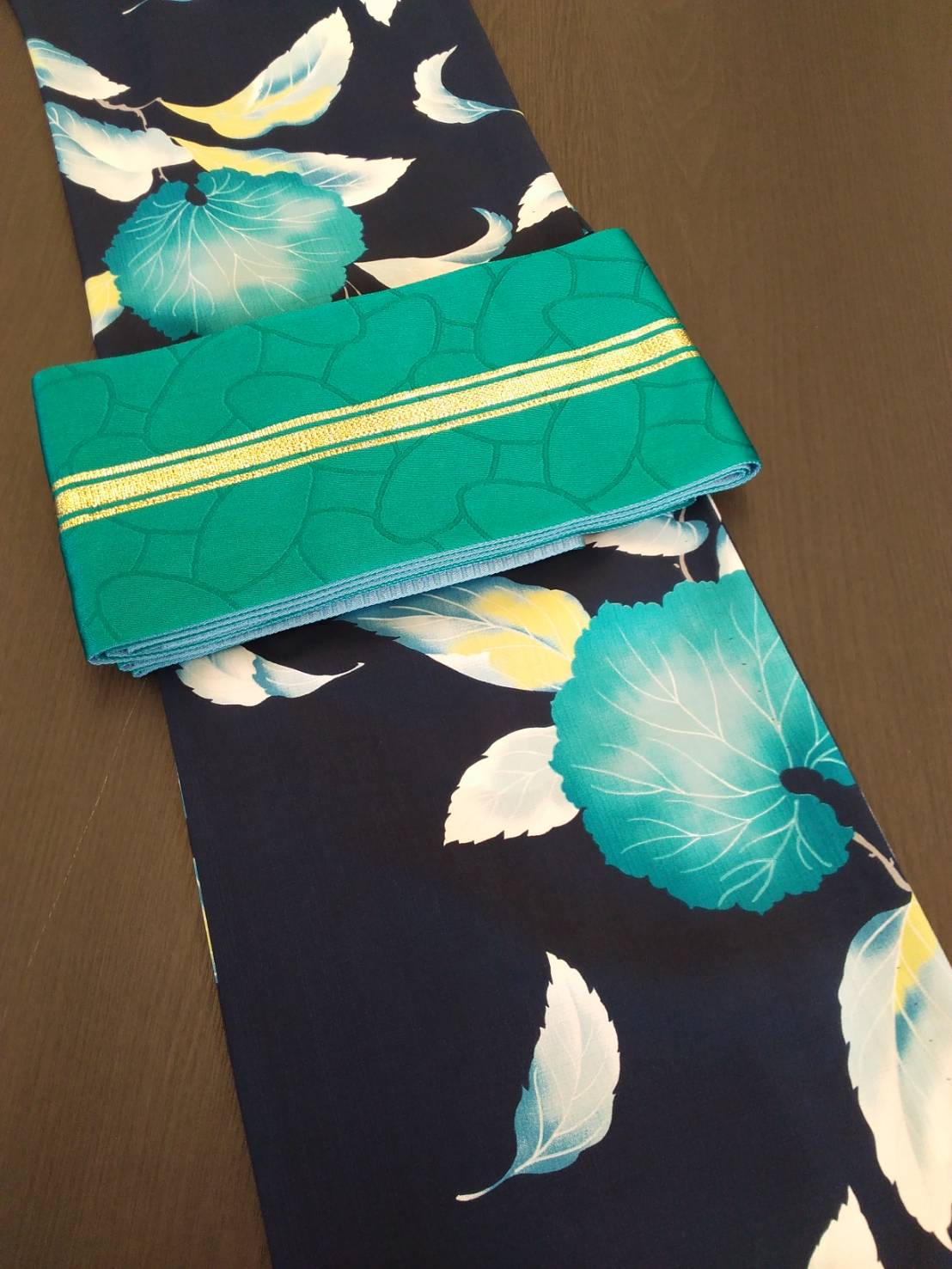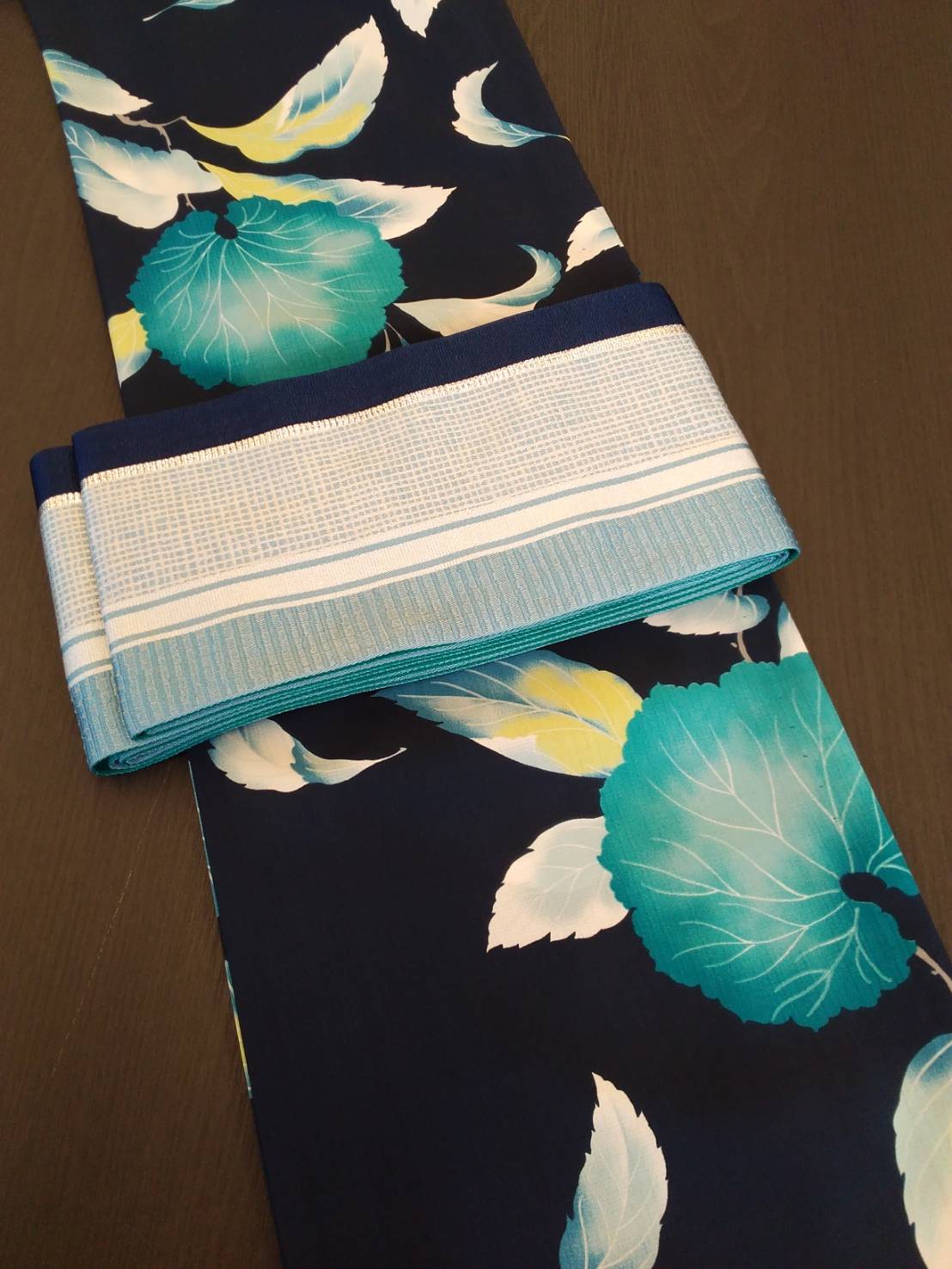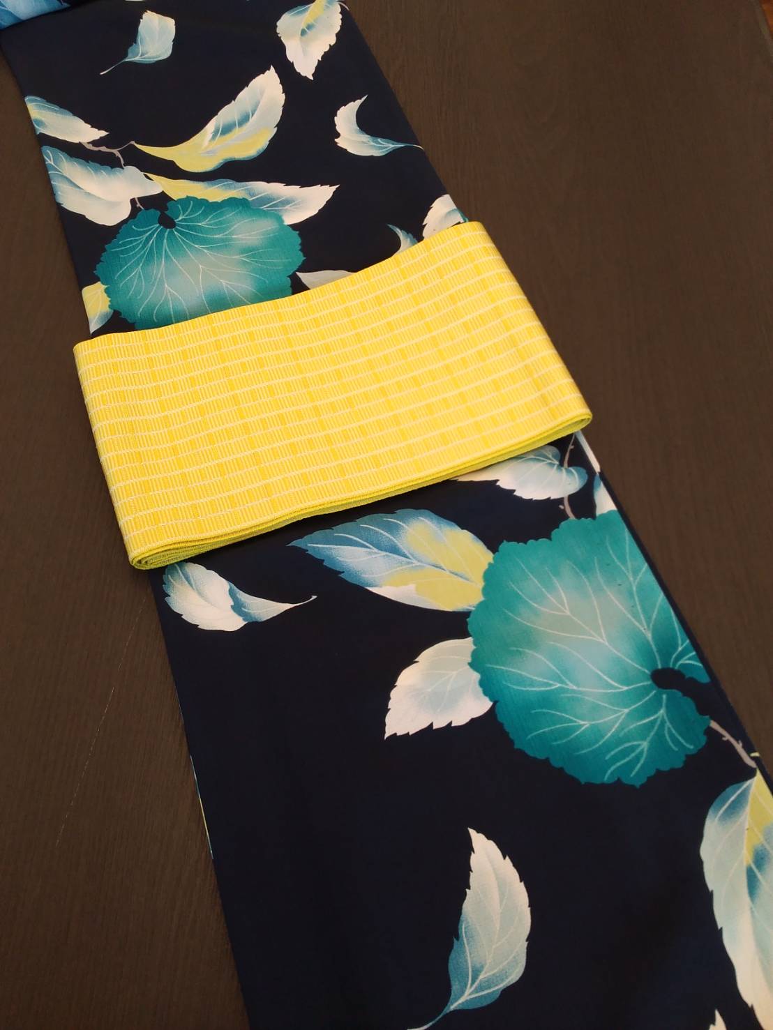 紺地につわぶきの柄の浴衣に今回は6パターン、帯を合わせてみました。