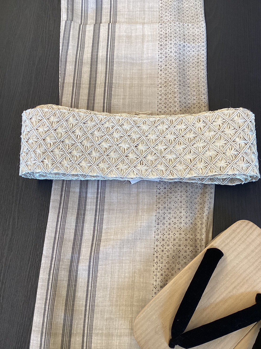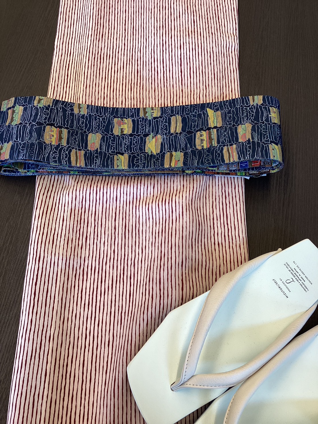 ハンバーガー柄の帯には、ストライプのゆかたを合わせて。