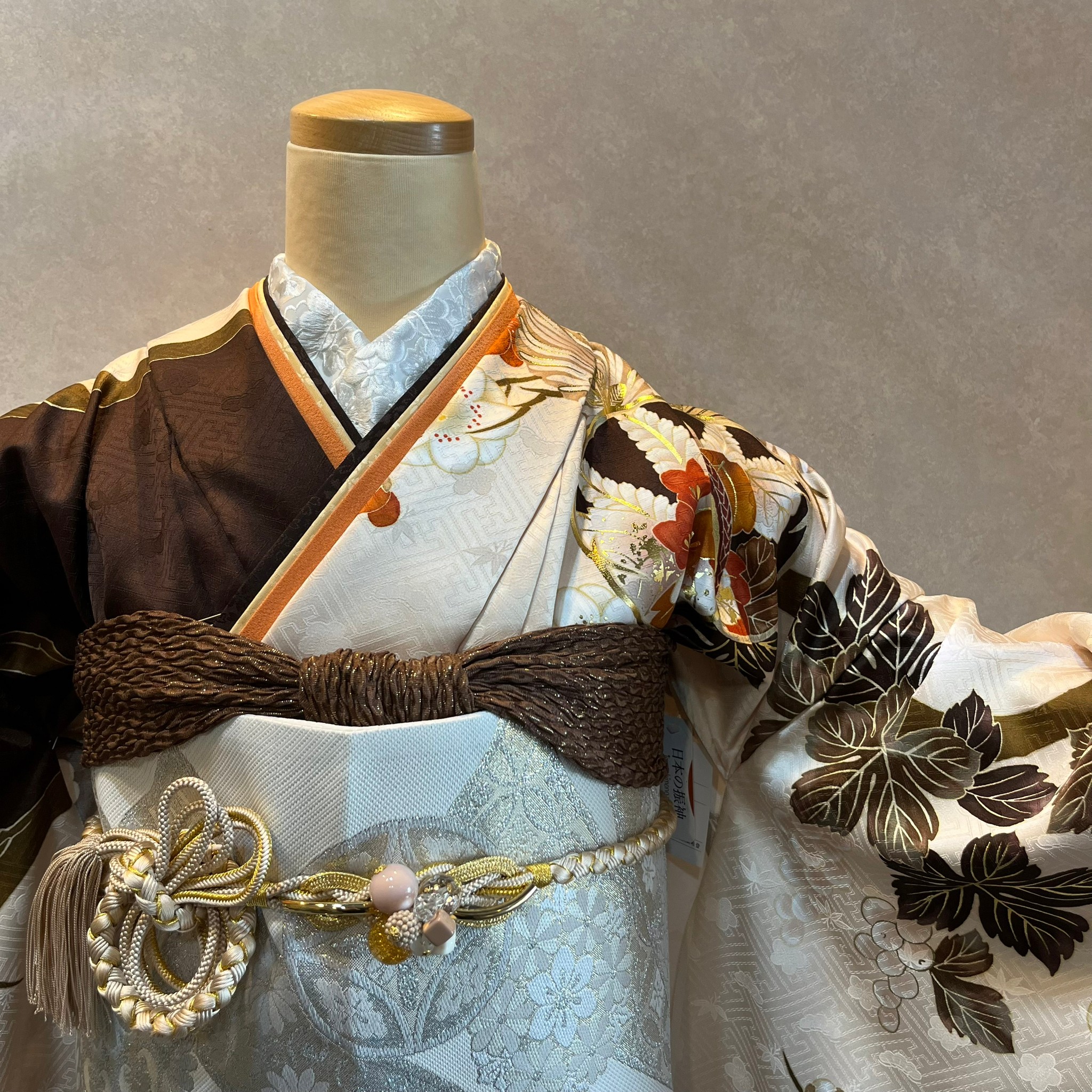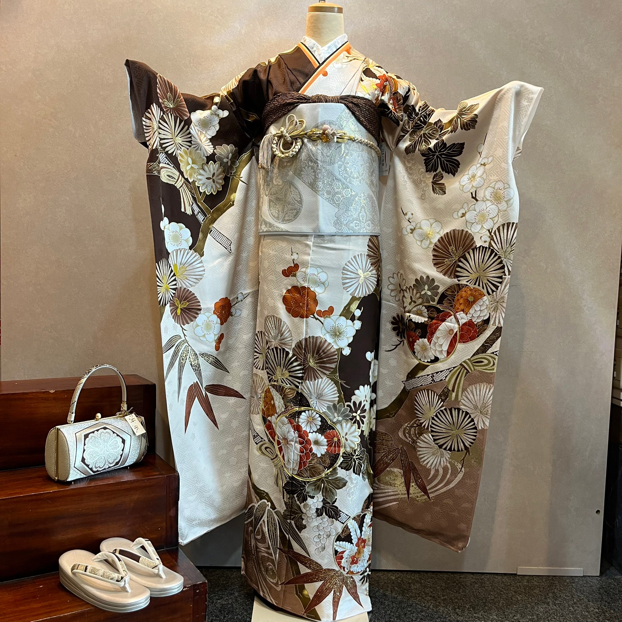 こげ茶と洗柿色に松竹梅の梅の枝で色の切り替えになっている、とても珍しいお振袖。