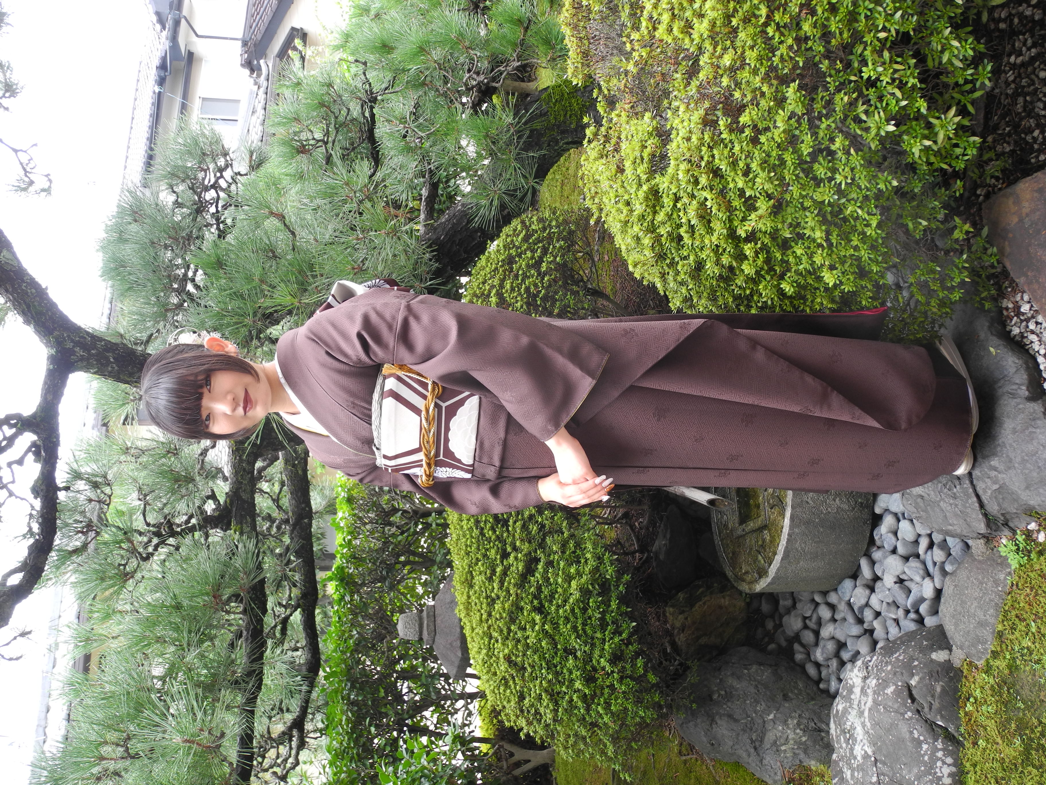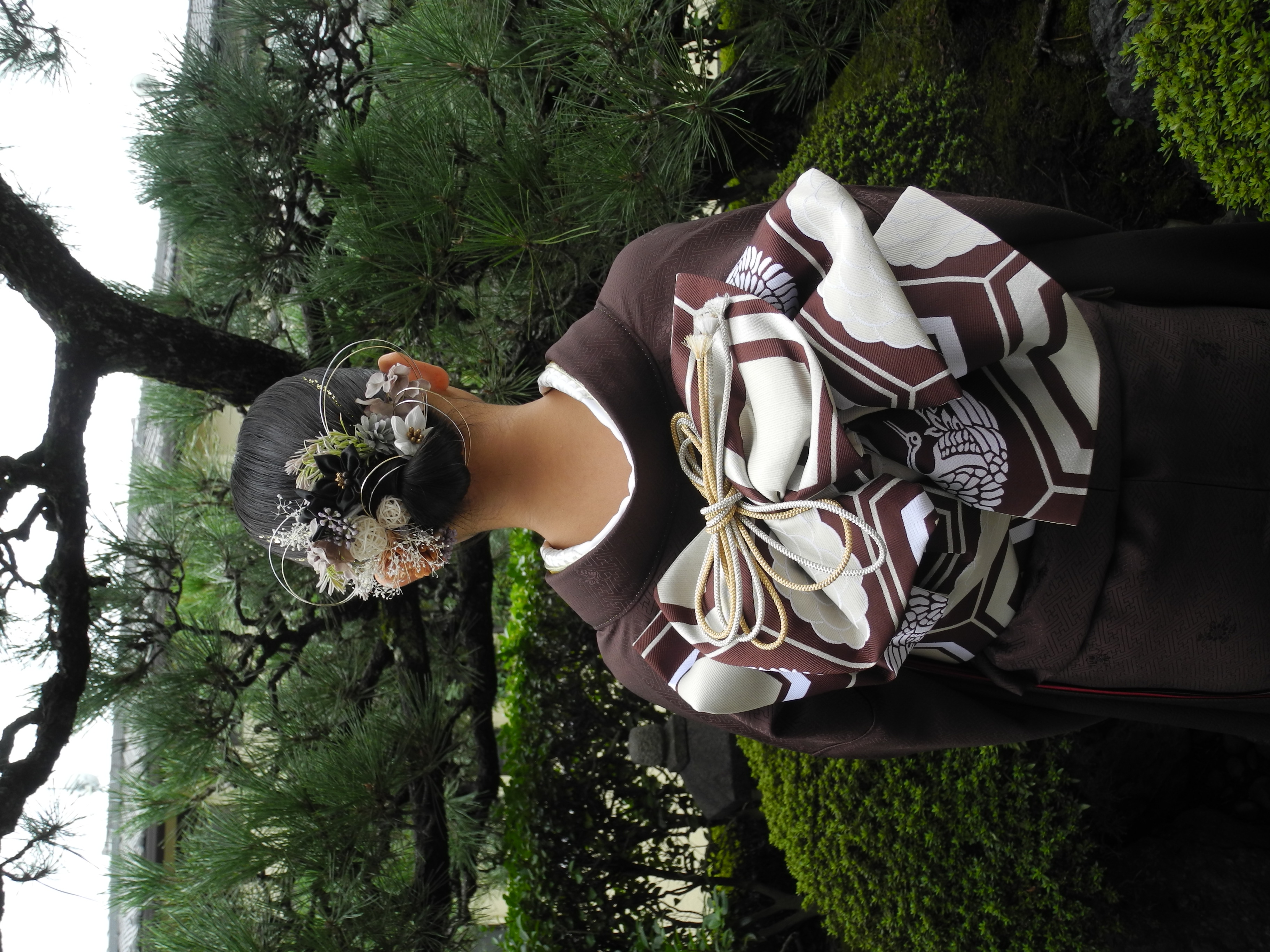 ブラウンの色無地をかっこよく着こなしていただいたお嬢様。シンプルな色無地のお振袖に、同系色の帯。色数少なく、同系色コーデがイマドキですね。