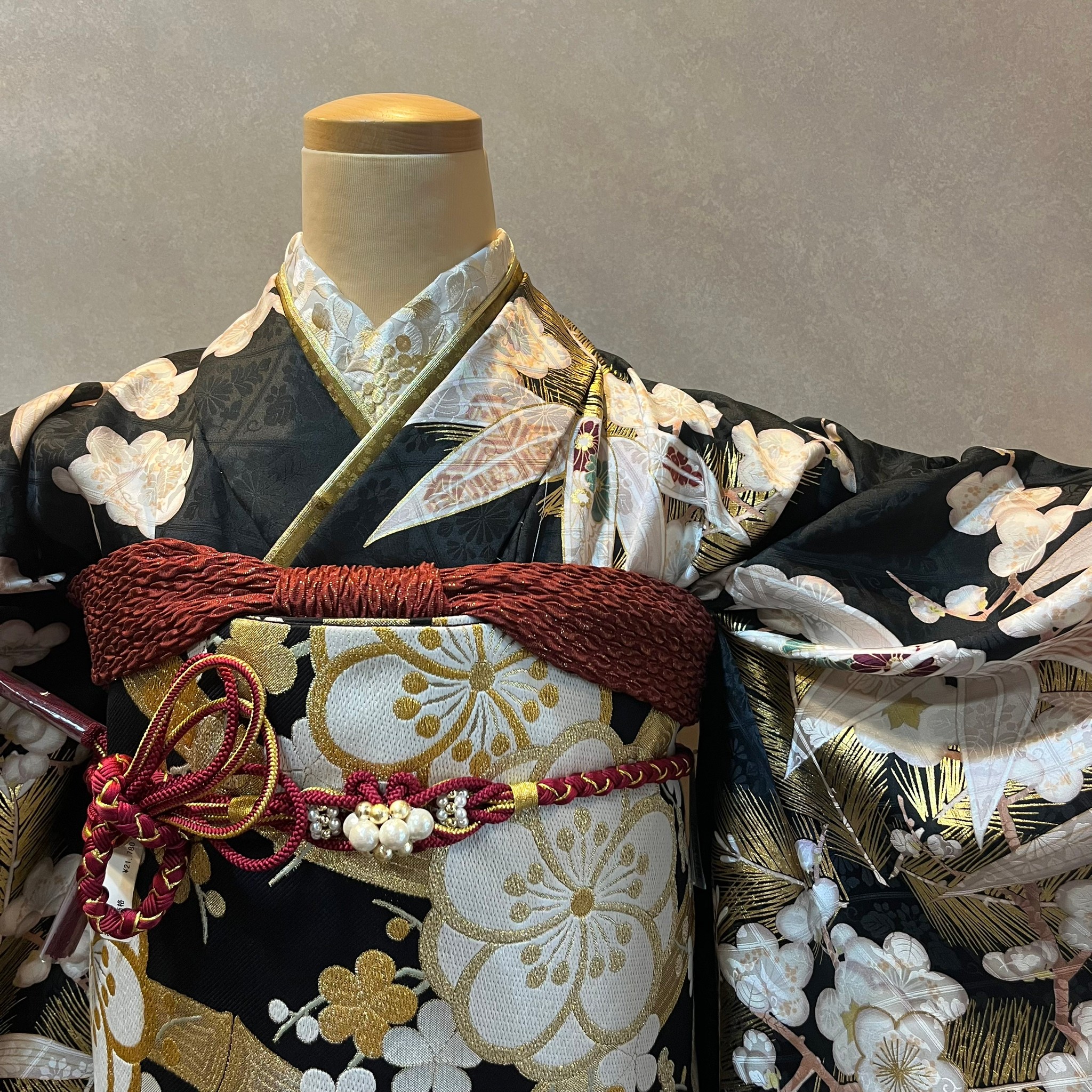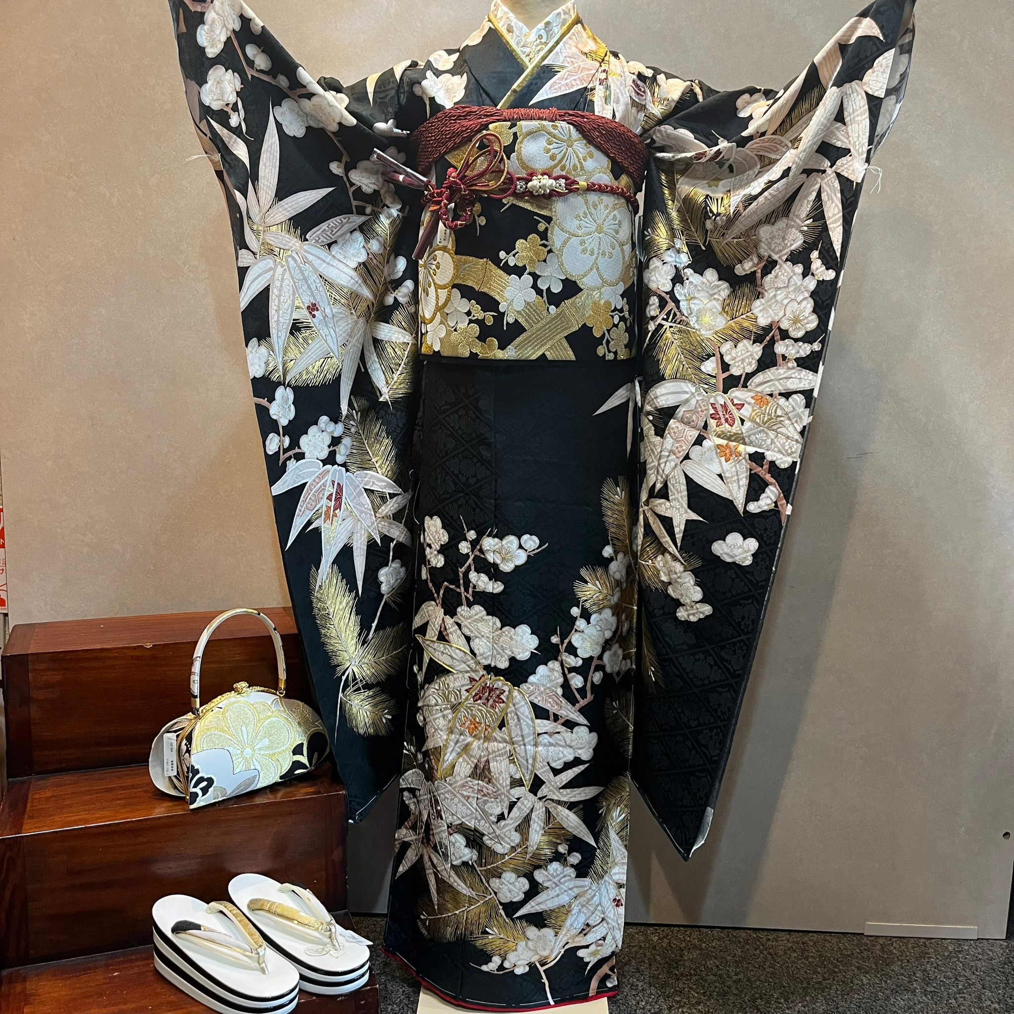 墨黒のお振袖に、白金で松竹梅が描かれています。