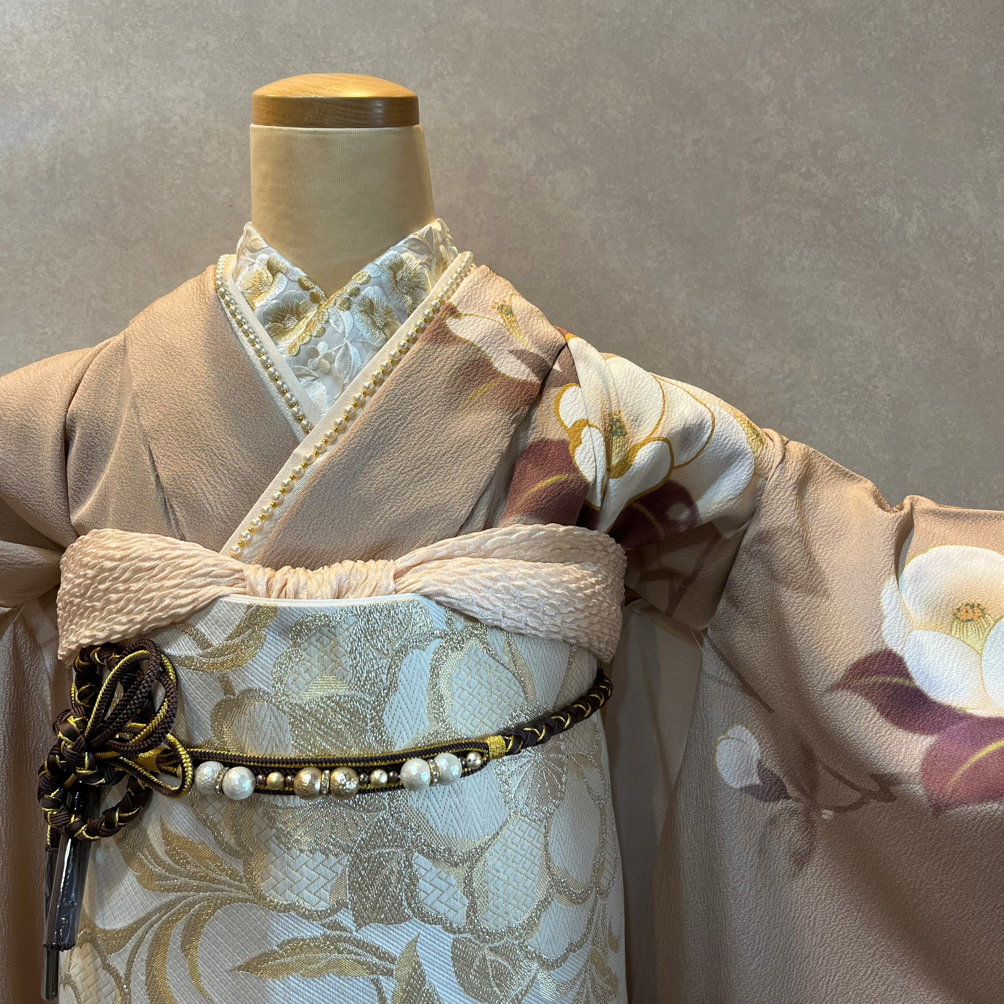 人気のナチュラルカラー系でまとめられて染められたお振袖なので、優しい雰囲気になるように虹色(明るい灰みの赤系のピンクのような色)をあわせ、帯締めだけは濃い茶色で締め色に。