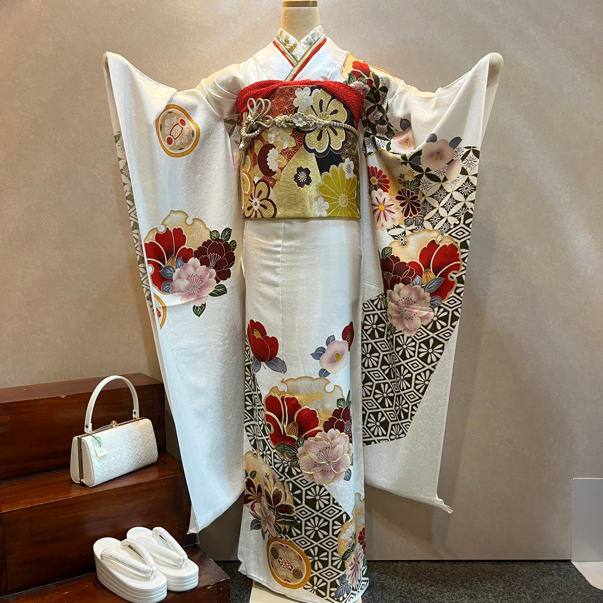 白地に雪輪の中に椿や桜が描かれたお振袖。