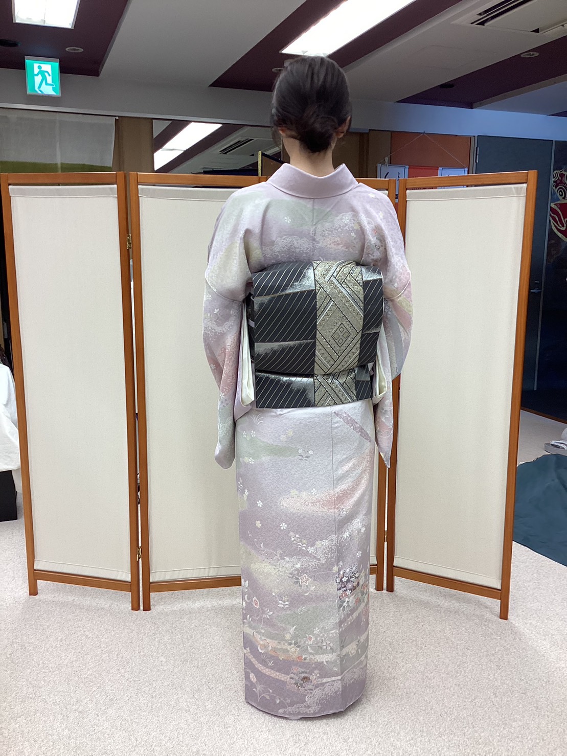 こちらの生徒さんは、浴衣教室から始め、着物を着て、名古屋帯、袋帯までトータル9回(1時間半を9回)でこのように着用できるようになりました。