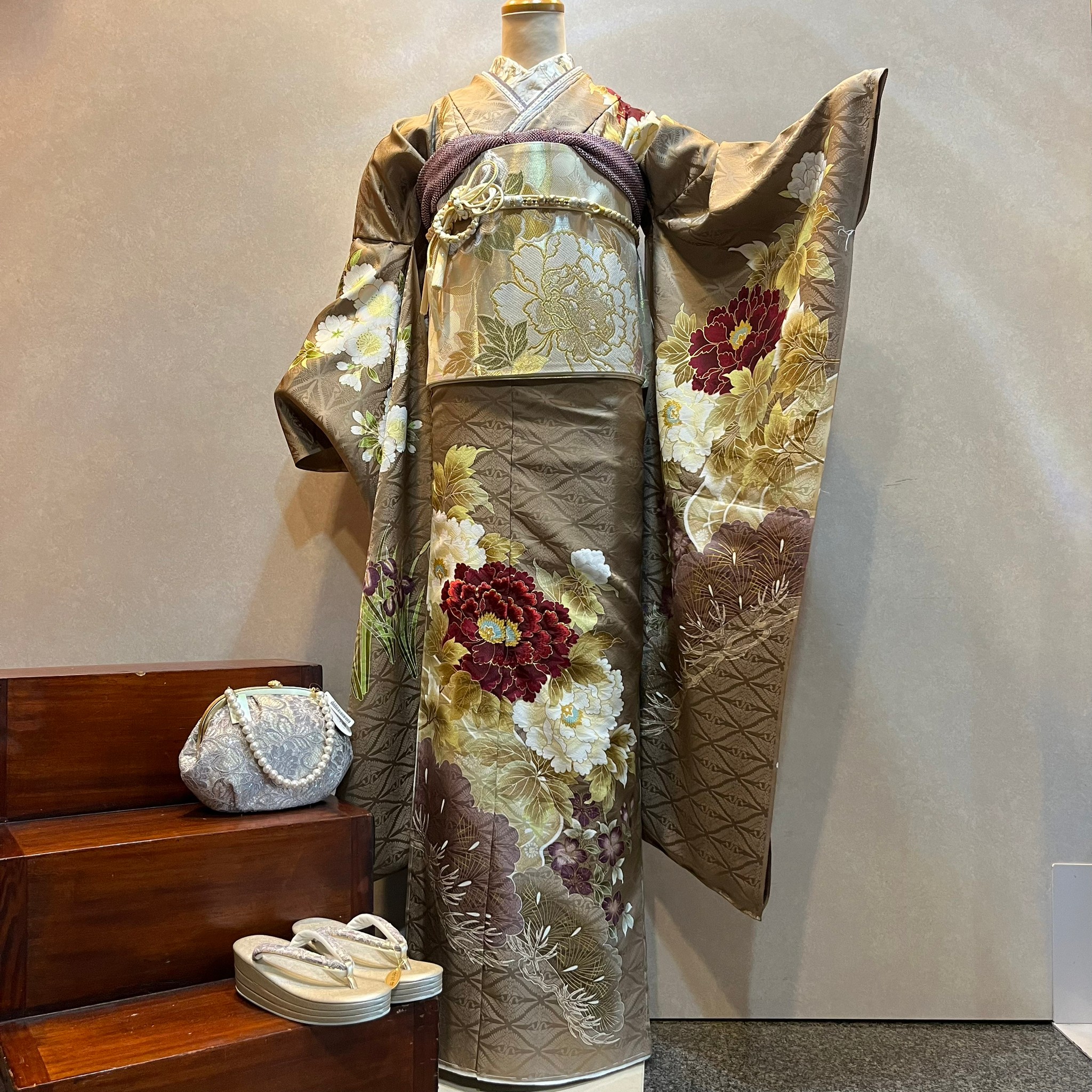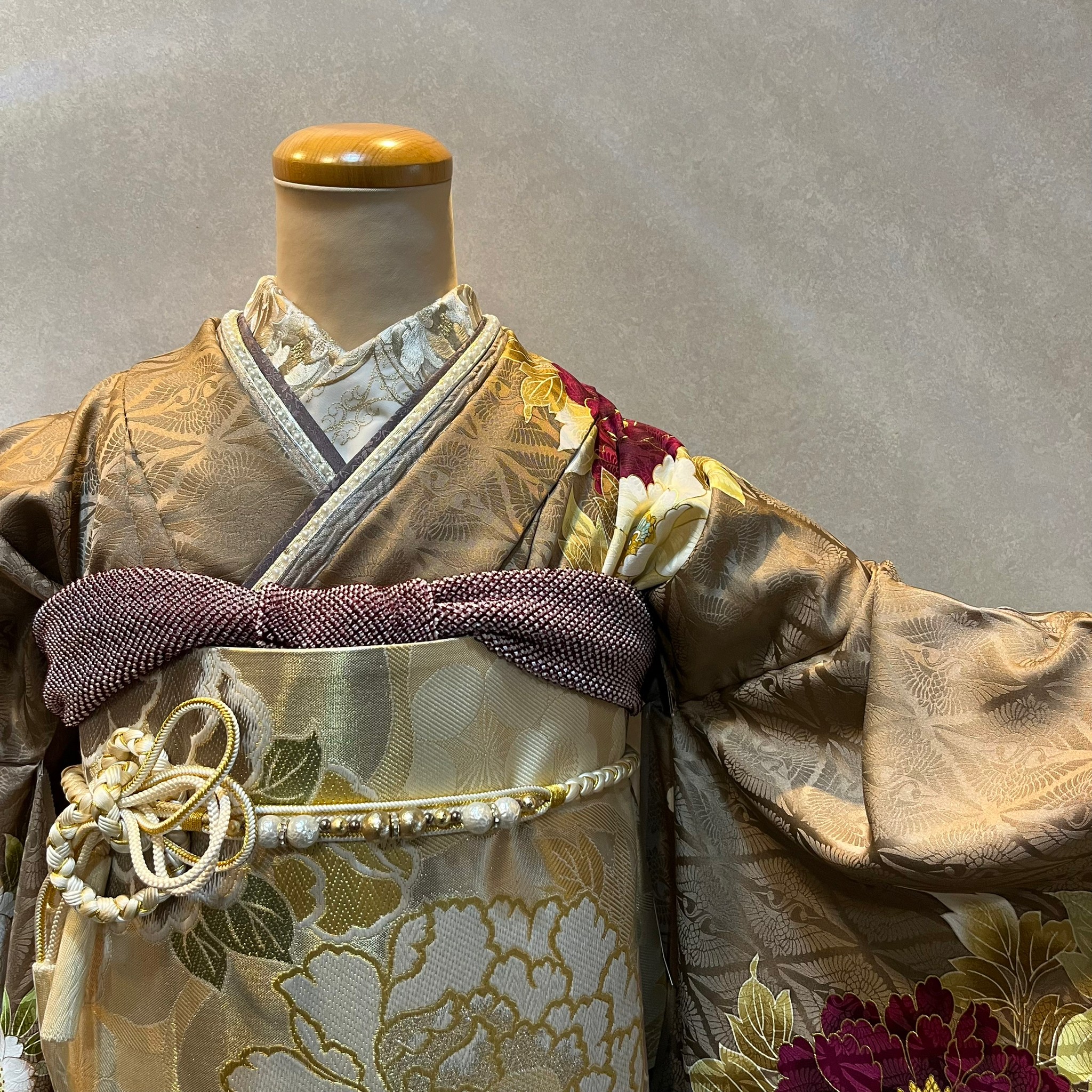 肥後煤竹色のお振袖に、大きな牡丹柄のお振袖。