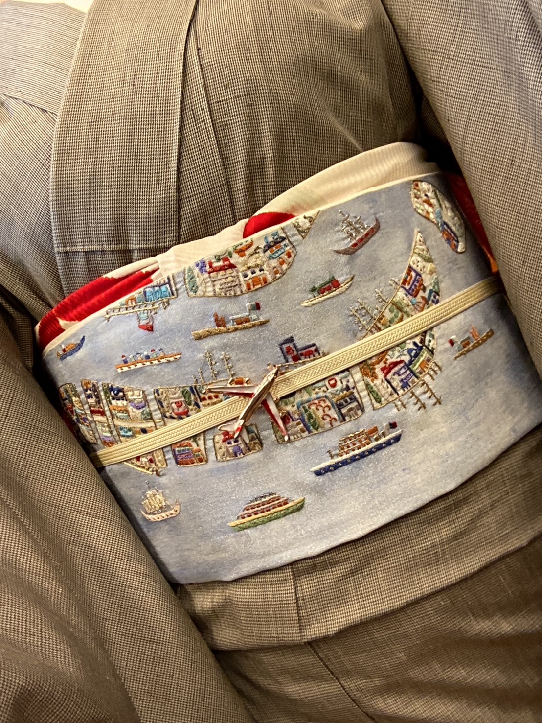 イタリアのベネチアを刺繍した帯に、飛行機の帯留めをすることで、上空からの風景のように見えて、さらに可愛い💕