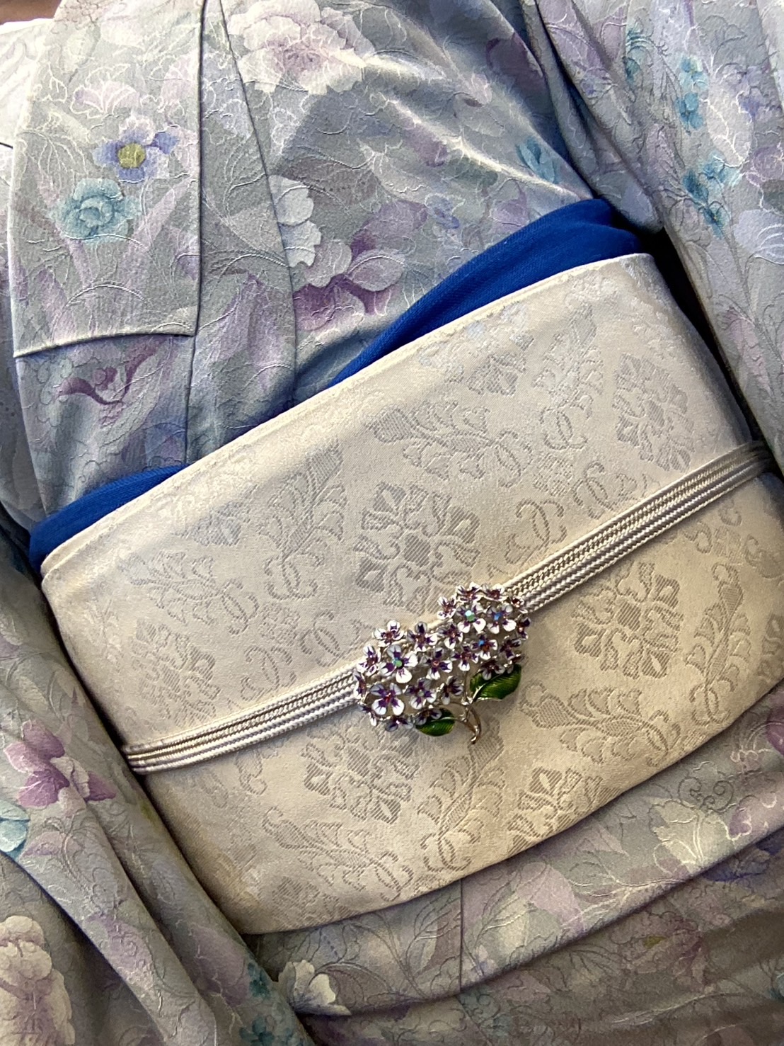 紫陽花、水仙、百合などの四季折々の花々が描かれた小紋に合わせて、紫陽花の帯留めを合わせて💜