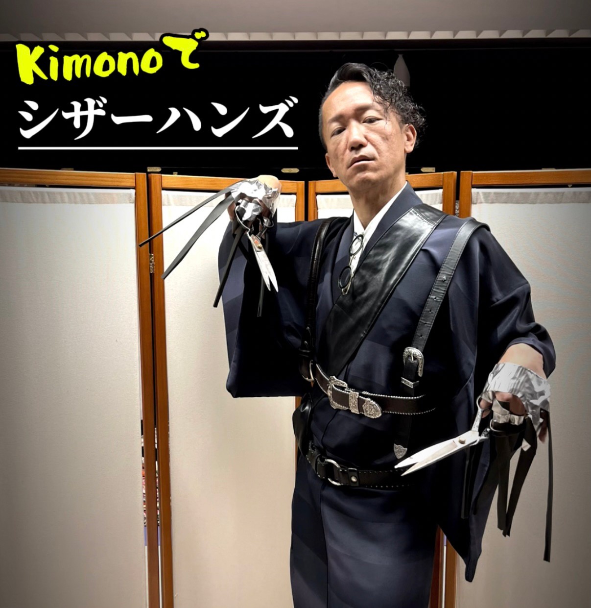 シザーハンスは髪の毛を切ったり、氷の彫刻を作ったりしていましたが、もちろん着物屋なので、着物にベルトをたくさん巻き付け、裁縫用ハサミを持った、きものくらちのシザーハンズには着物を作ってもらいました。