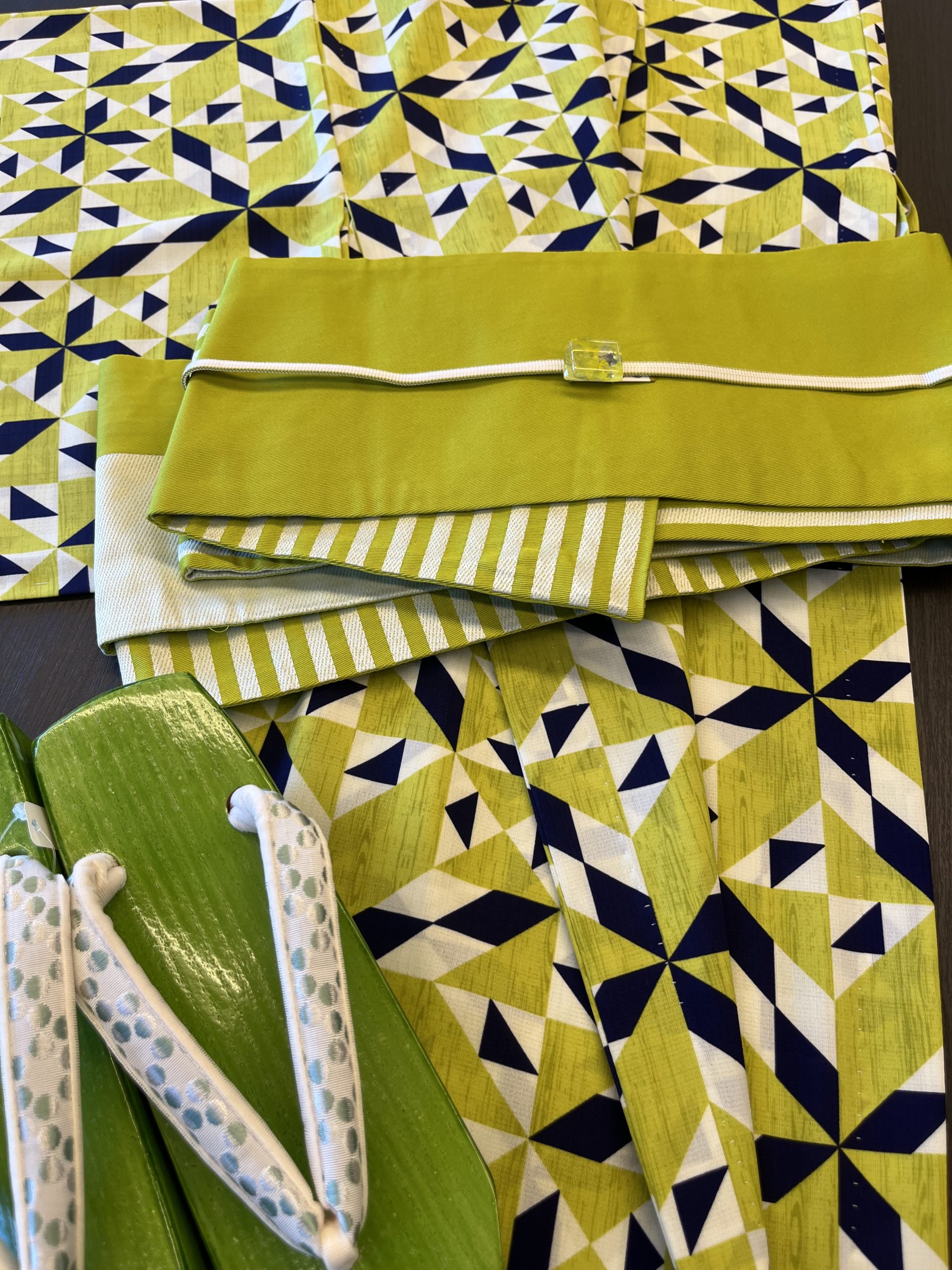 紺か、白か、黄緑の帯を合わせるなら、一番派手になりそうな黄緑の帯を合わせて、帯留めは黄色。下駄も黄緑。