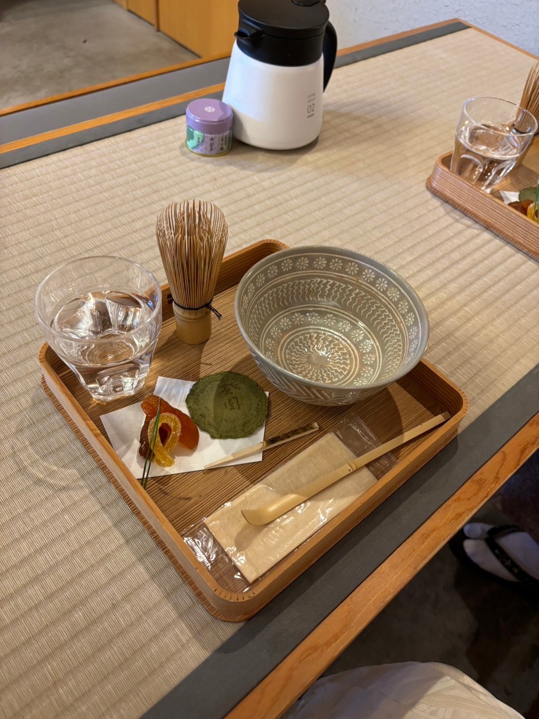 畳みの机に盆、茶碗、茶杓、茶筅、菓子が置かれていて、お姉さんが説明してくださいました。