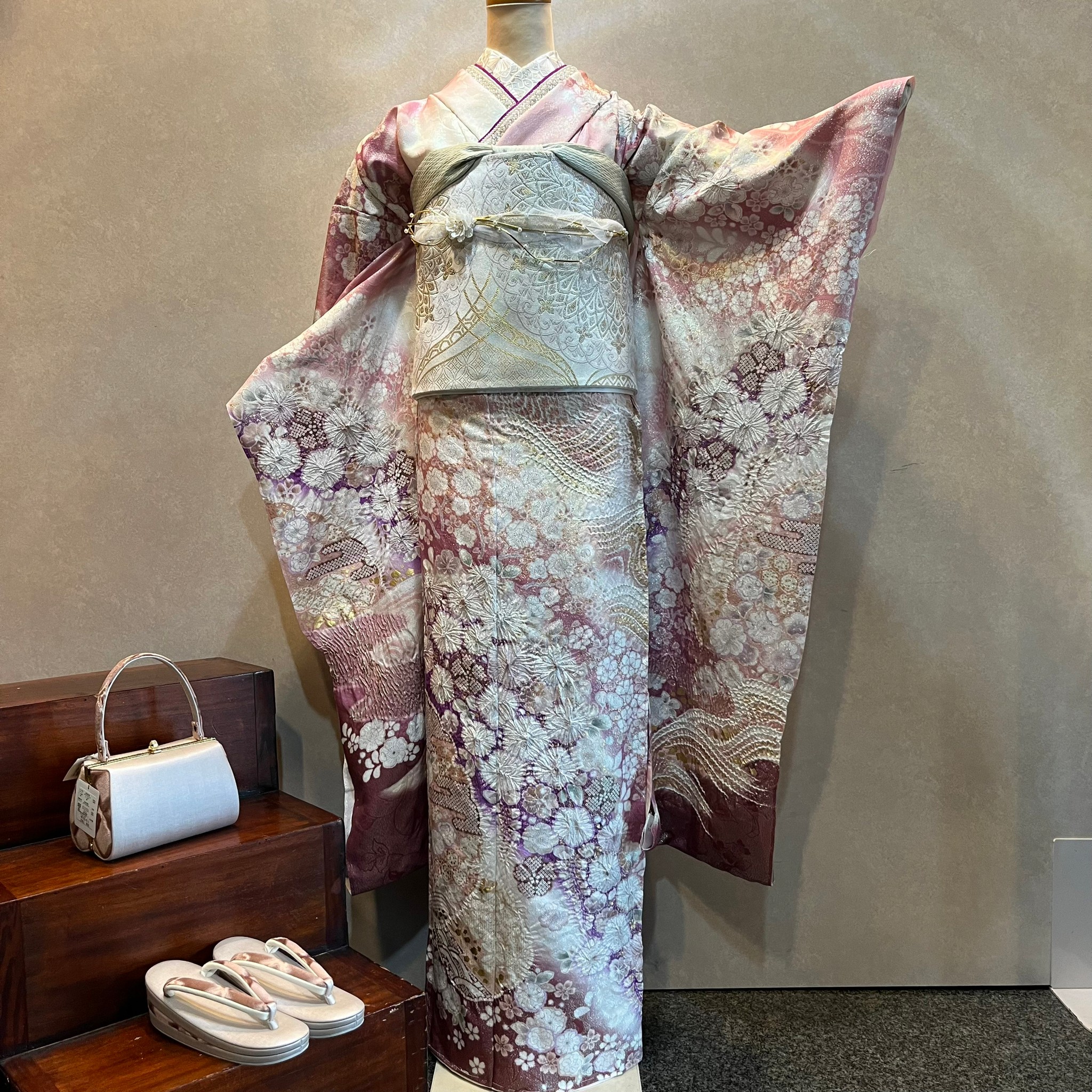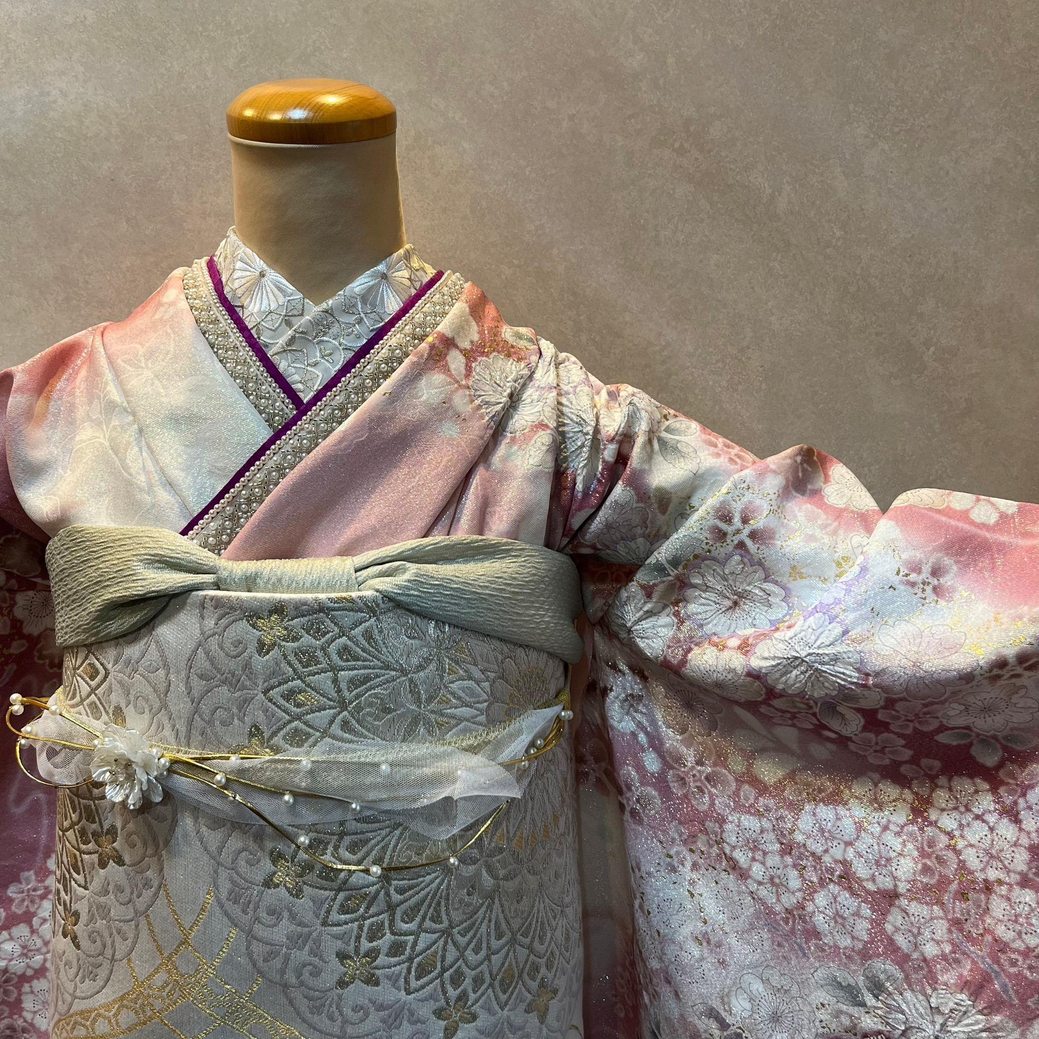 白地にスモーキーピンクのぼかしが入っていて、伝統的な辻が花模様が美しいお振袖。
