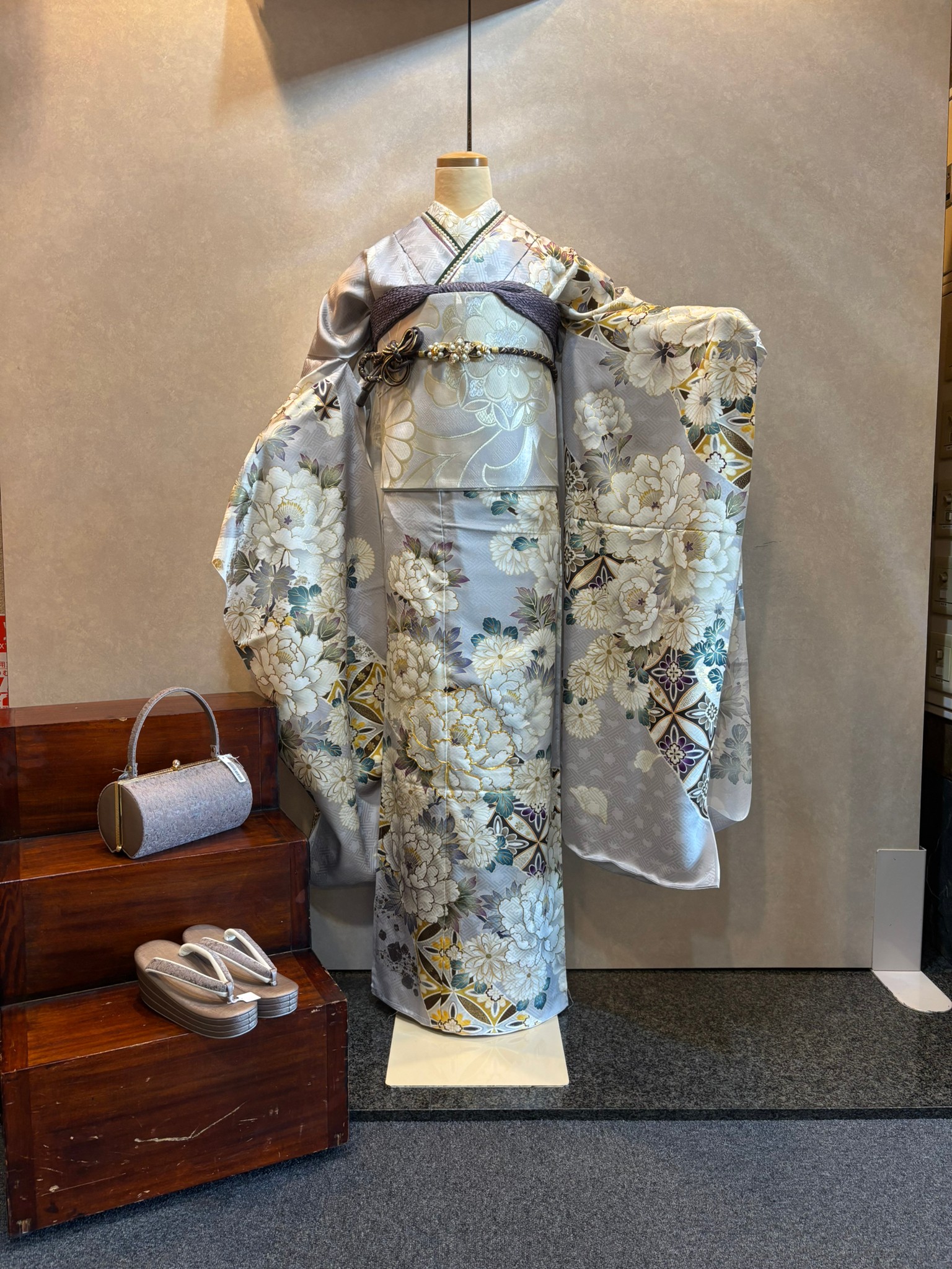 薄灰色に大きな白い牡丹が描かれたお振袖。