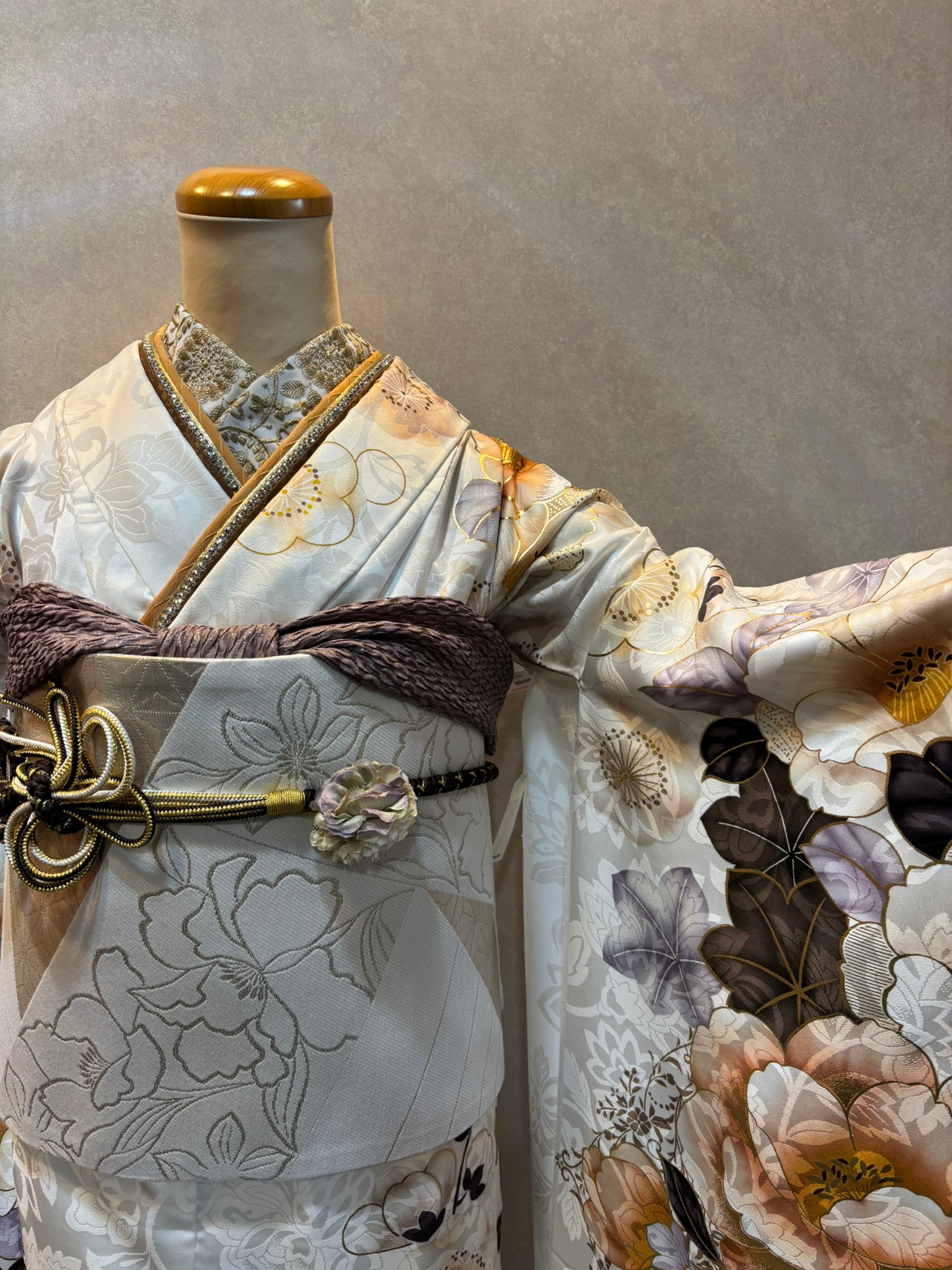 地模様の唐草文様の艶感と、ナチュラルカラーが可愛いお振袖。