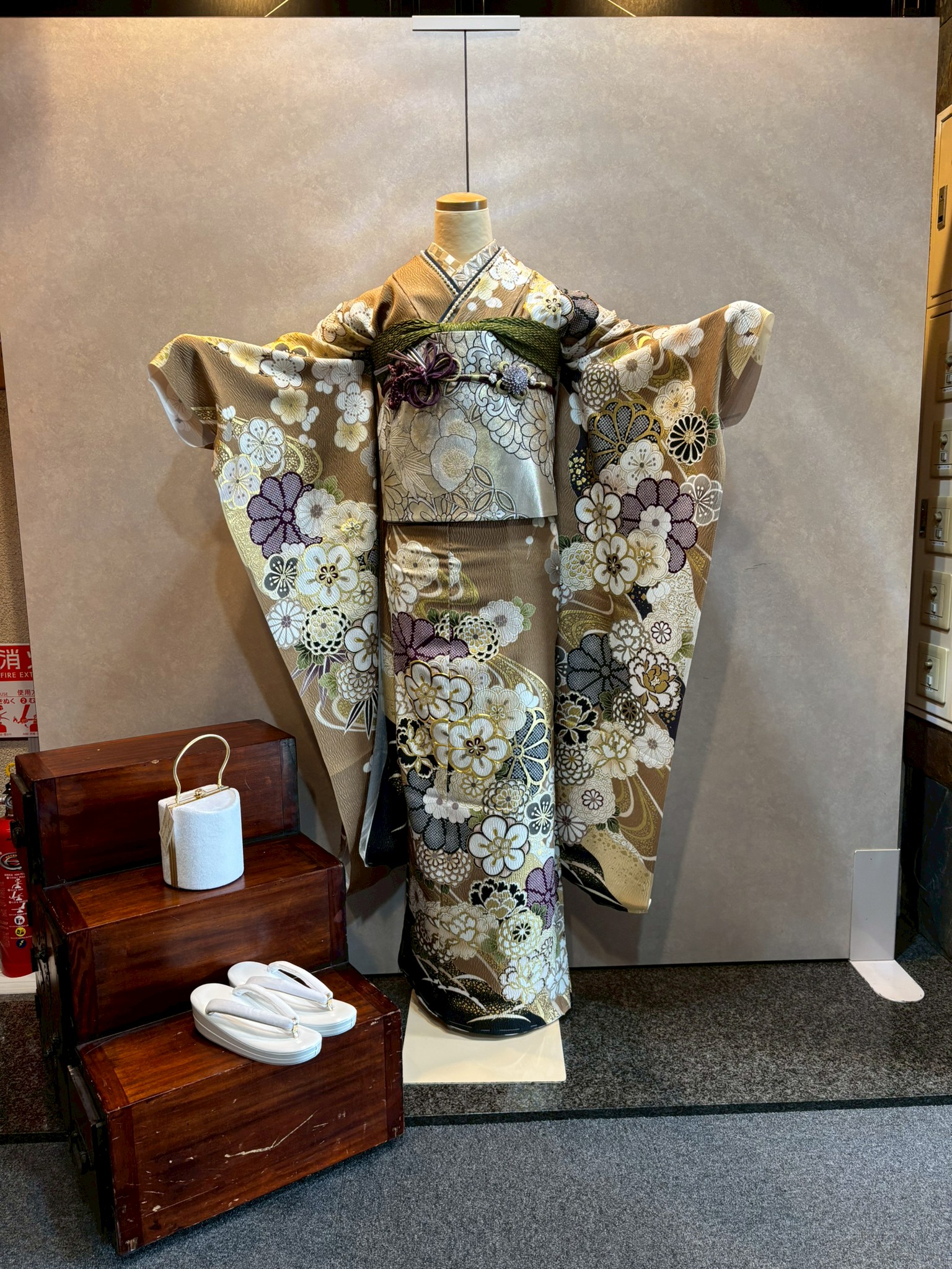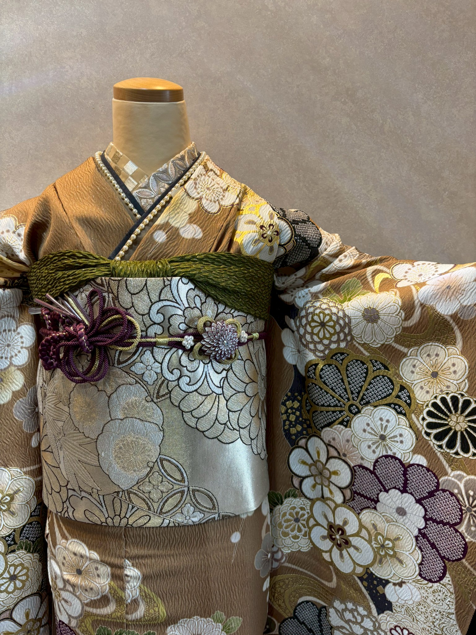 帯も、梅菊を合わせて、小物はダークグレイッシュ系の色味で合わせました。