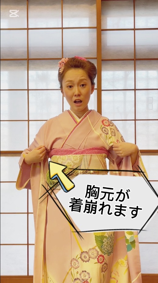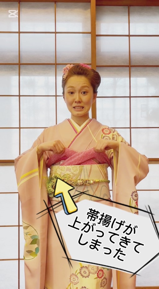 そうすると、帯揚げが出てきて、胸元の着物がたぷたぷに緩んで出てきます。