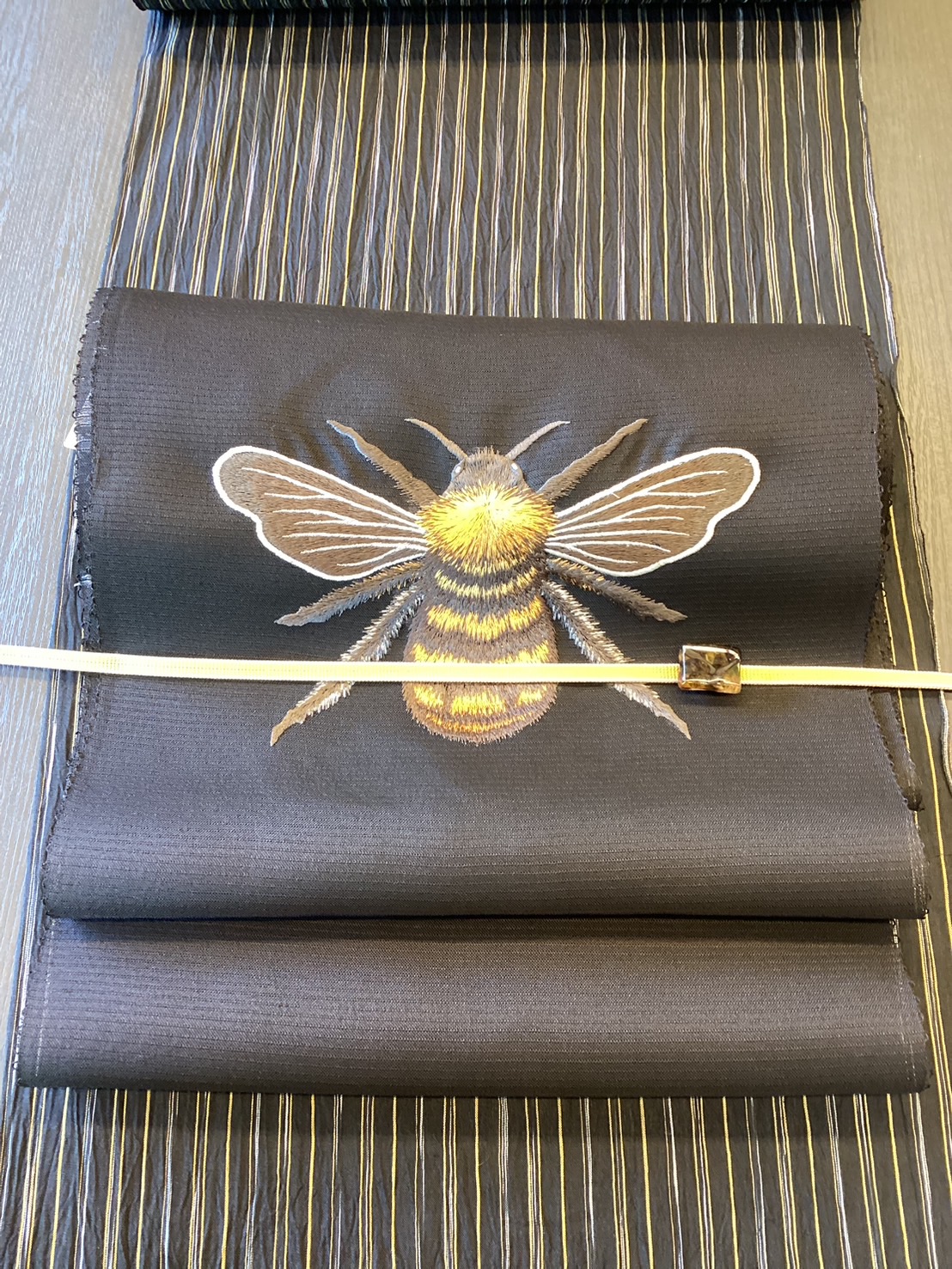 ランダムな縞模様の小千谷ちぢみに誉田屋源兵衛の夏帯、ミツバチを合わせました。