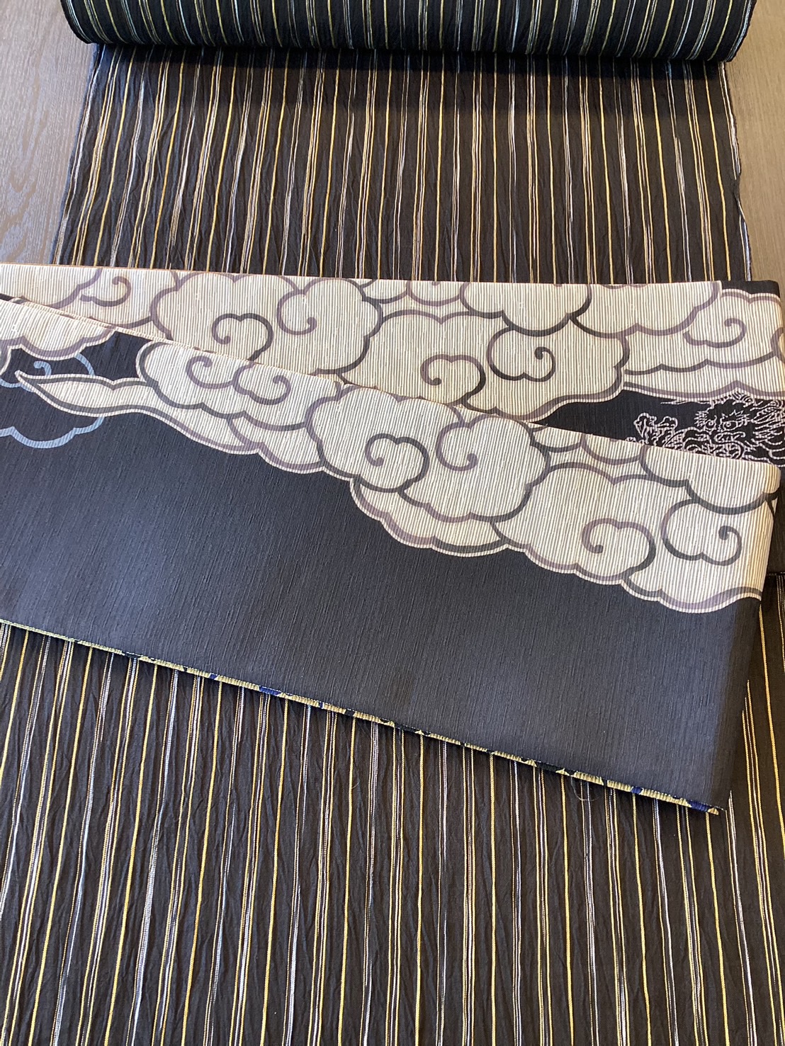 縞模様を雨に見立てて、雲と龍の描かれた半幅帯を合わせました。さらに大人っぽく着るなら、帯締めや帯留めを合わせると、ワンランク上のおしゃれコーデになりますよ。